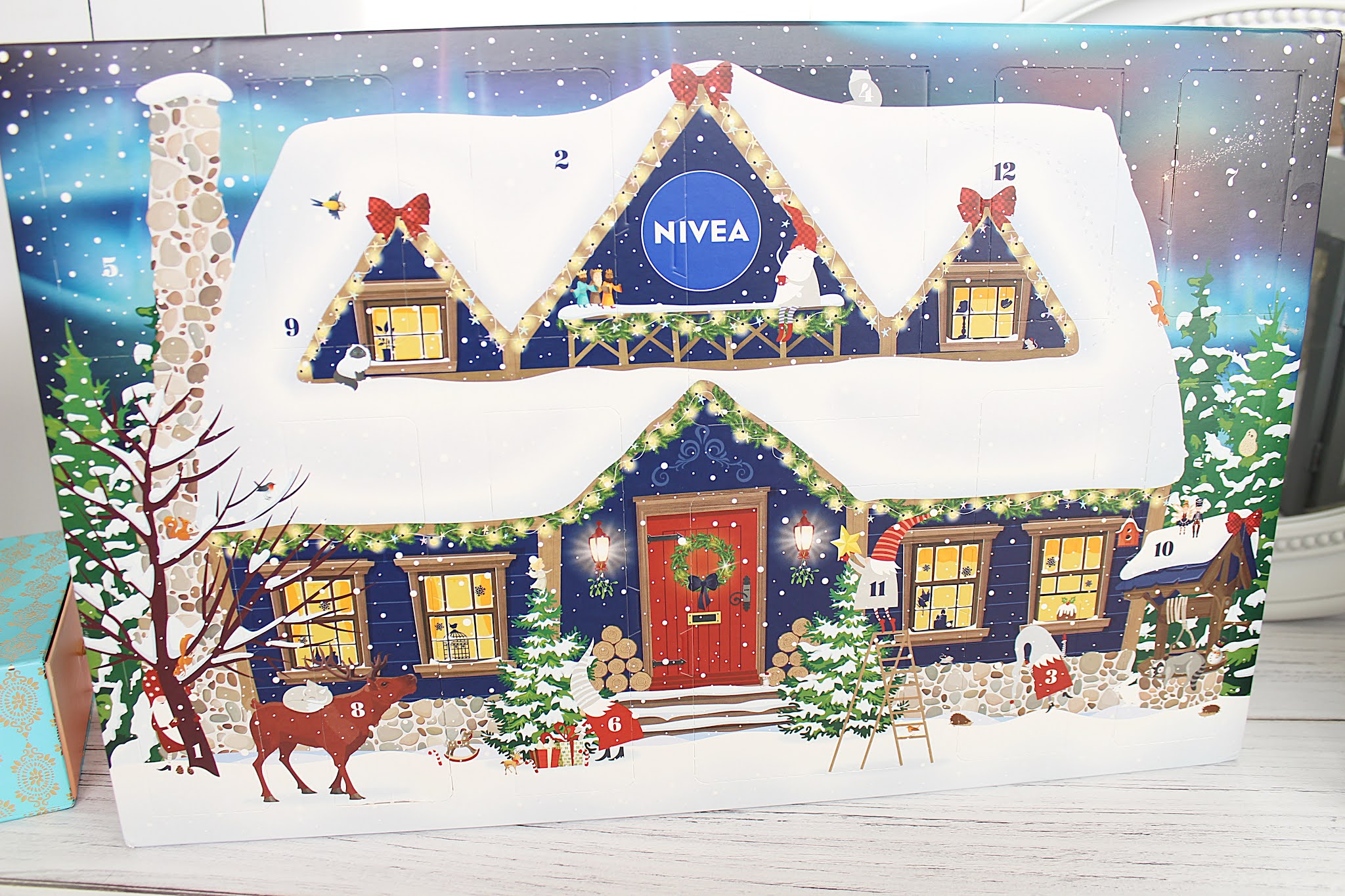 Kalendarz ma kształt prostokąta i wyglądem przypomina świąteczną chatkę w zimowej scenerii. Jeśli chodzi o wygląd to według mnie jest to jeden z najbardziej świątecznych kalendarzy kosmetycznych na rynku. Myślę, że z powodzeniem mógłby to być kalendarz adwentowy z zabawkami/gadżetami dla dzieciaków. Podczas pisania tego postu wpadłam właśnie na taki pomysł: Logo Nivea zakleję spadającą gwiazdą i użyję kalendarza ponownie. Mój młodszy syn będzie zachwycony gdy w takim zimowym domku znajdzie coś miłego.