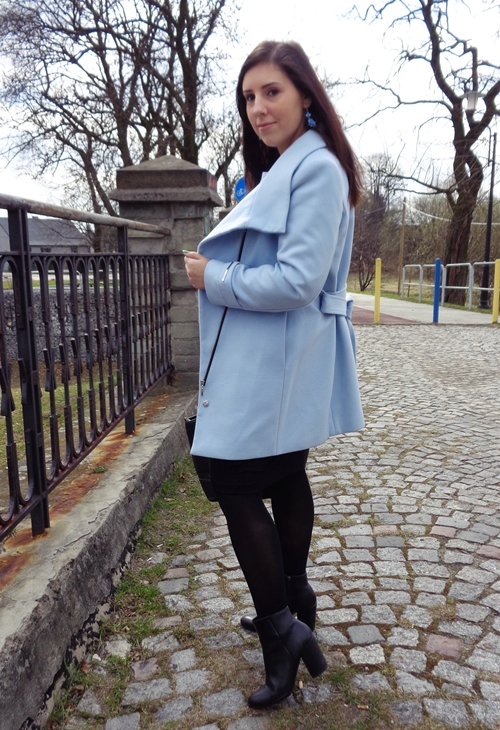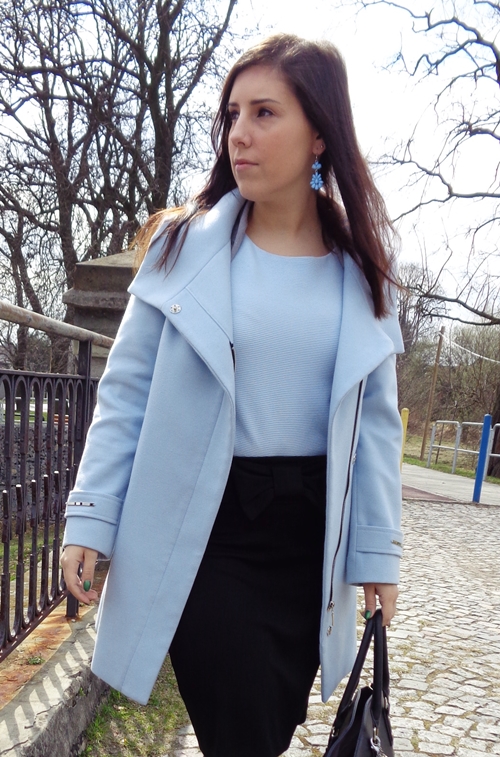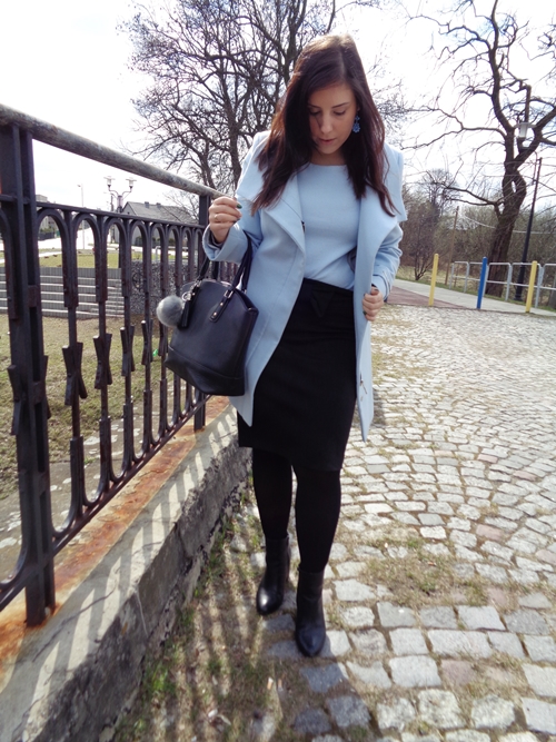Zobacz oryginał pon., 27/03/2017 - 21:00 Tak na prawdę chciałam założyć coś zupełnie innego, ale pierwsze dni wiosny bardzo mnie rozczarowały. Porzuciłam więc póki co cieńsze kurteczki na rzecz ciepłego płaszcza. Jego pastelowy kolor i srebrne wykończenia nie pozostawiają wiele miejsca na improwizację więc postawiłam na bezpieczne połączenie z czernią.