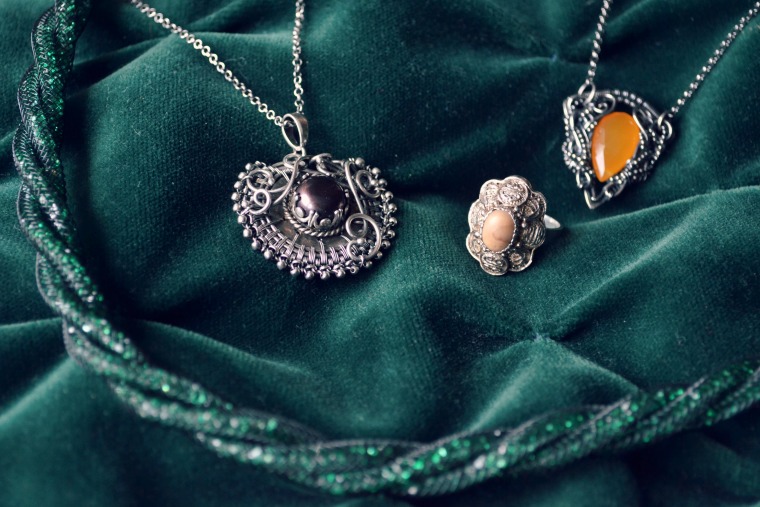 Ostatnio przybyło mi też kilka nowości biżuteryjnych: pleciony naszyjnik i bransoletka w komplecie za 10 złotych (dają naprawdę fajny, elegancki efekt bez przesadnego błysku, za którym na co dzień nie przepadam), pierścionek od mamy oraz dwa srebrne naszyjniki, robione techniką wire-wrapping, która polega na formowaniu fantazyjnej biżuterii ze srebrnego drutu przy wykorzystaniu np. kamieni (w moim przypadku jest to chalcedon i perła). Naszyjniki są bardzo efektowne - mimo że wybrałam raczej mniejszy rozmiar i tak wyglądają zjawiskowo.