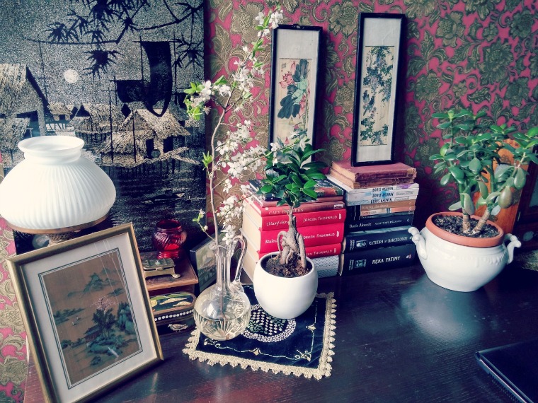 Oprócz wspomnianych remontów postanowiłam sobie na wiosnę, że zajmę się wszystkimi niedoróbkami i prowizorkami, jakie królują u mnie w domu (no może większością, bo niektóre wymagają męskiej ręki i bez pomocy Włóczykija się nie obejdzie). Tak więc doszywam frędzle do leżących z tego powodu odłogiem serwet, maluję lampy i oprawiam nieoprawione obrazki, dzięki czemu m.in. mój piękny chiński pejzaż malowany na jedwabiu, może wreszcie godnie ozdabiać biurko.