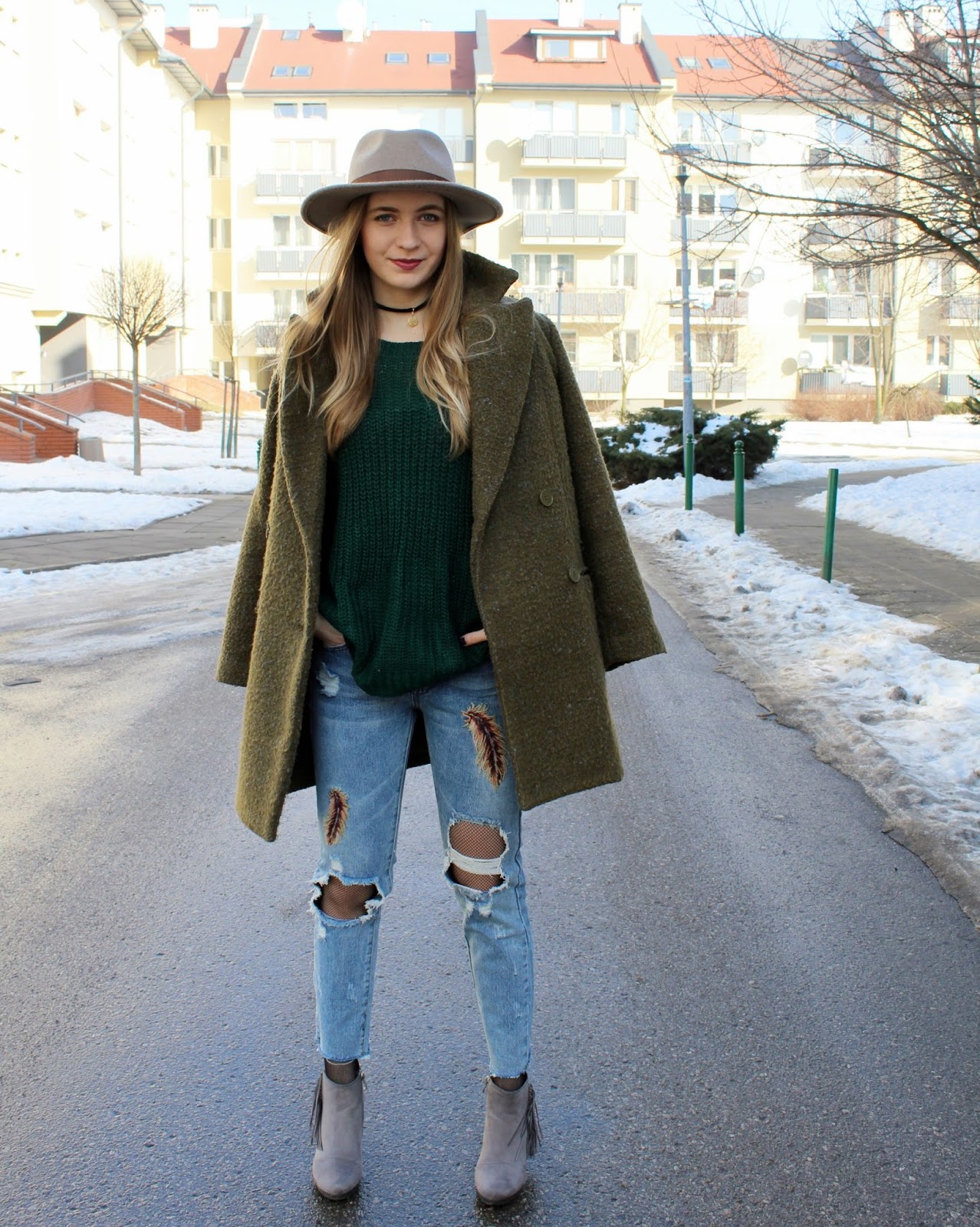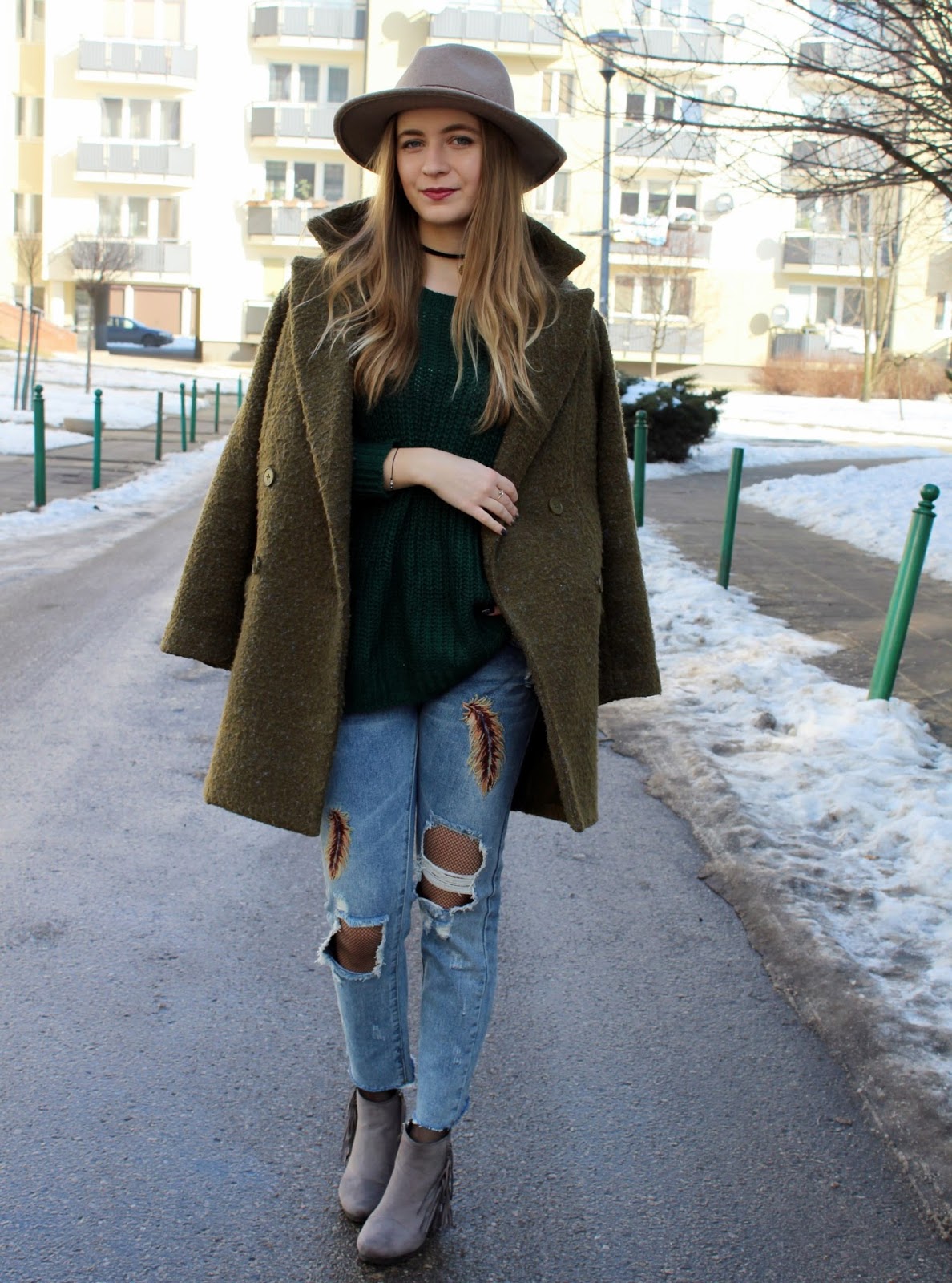 Jeansy z dosyć dużymi wycięciami i pięknie haftowanymi piórami wraz ze swetrem to moje łupy z DressLink. Jeans-ami jestem zauroczona, są miękkie i wygodne, już chciałabym je móc nosić dzień w dzień. Odcień zieleni, który widzicie na płaszczu to moja wielka miłość, jak i sam płaszcz, który znajdziecie na Bon Prix. Uniwersalny krój i ciekawy kolorek ;)