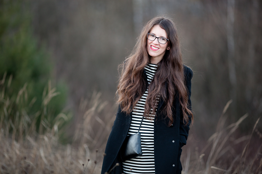 Zobacz oryginał czw., 25/02/2016 - 10:19Zostałam okularnicą (ponownie). Ostatnie okulary miałam na nosie w podstawówce, ale nie cierpiałam ich nosić, bo były źle dobrane. Mój synek spogląda jeszcze na mnie z nieufnością, a i sama mam jeszcze problem z oswojeniem się z nowym wyglądem. Dzięki białym elementom oprawek, mogę teraz nosić do woli ubrania w czarnym kolorze i nie będę wyglądać ponuro. W Lidlu znalazłam świetną sukienkę w paski, która do moich okularów dopasowała się idealnie.