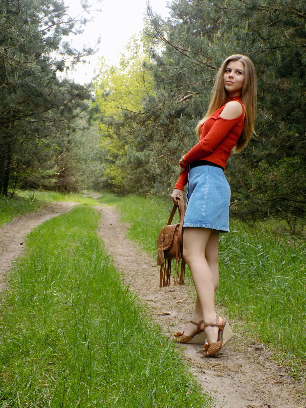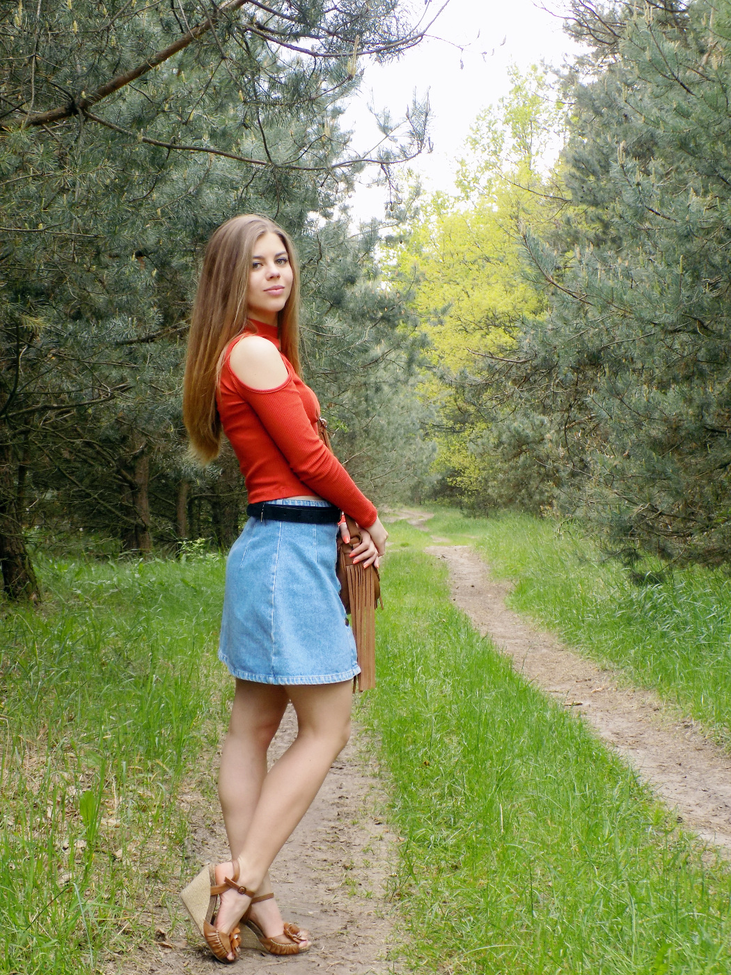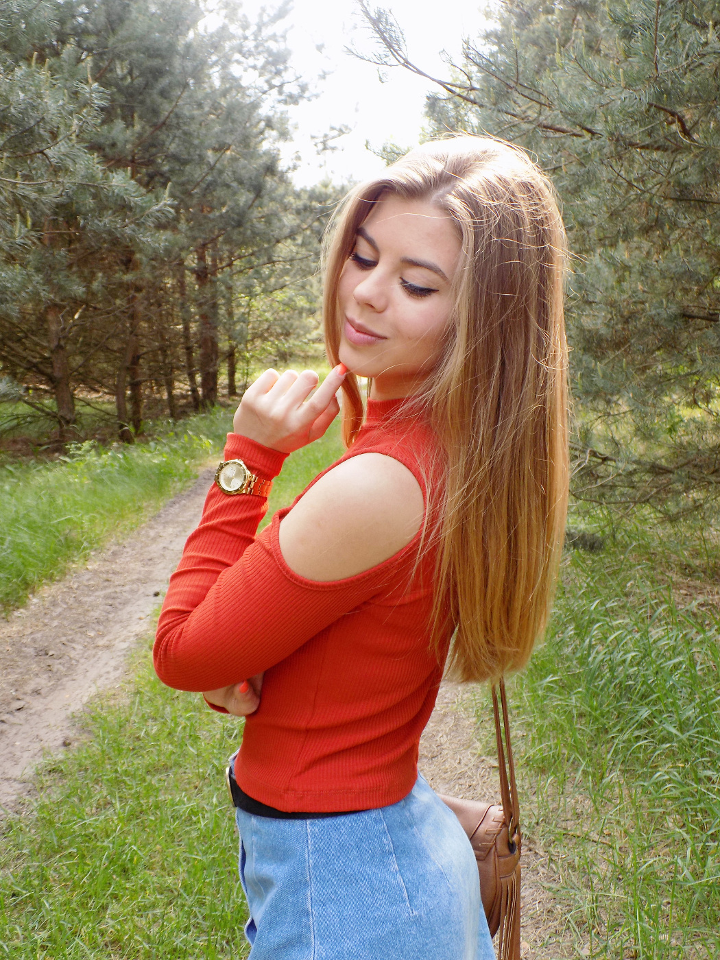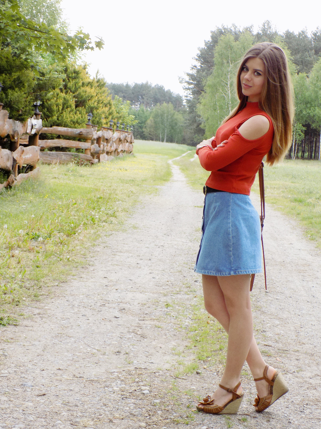 Zobacz oryginał śr., 25/05/2016 - 19:11Jestem wielką fanką odkrytych ramion. To zdecydowanie najwspanialszy trend na sezon wiosna-lato 2016. Dodaje uroku najprostszym fasonom bluzek. Nie jest to pierwsza stylizacja na blogu z odkrytymi ramionami i na pewno nie ostatnia :) Moja dzisiejsza stylizacja rodem z lat 70-tych to świetna propozycja na co dzień. Mam na sobie jeansową spódnicę z guzikami - to model trapezowy, który sprawdzi się dla wszystkich typów sylwetek. Do tego bluzeczkę z mini golfem z wycięciami na ramionach w kolorze pomarańczowym. Jeżeli zaś chodzi o dodatki to wyjęłam z głębi szafy moje ulubione koturny, z ubiegłego roku, a torebka jak i zegarek są już Wam dobrze znane :) Podoba Wam się powrót mody z lat 70-tych?