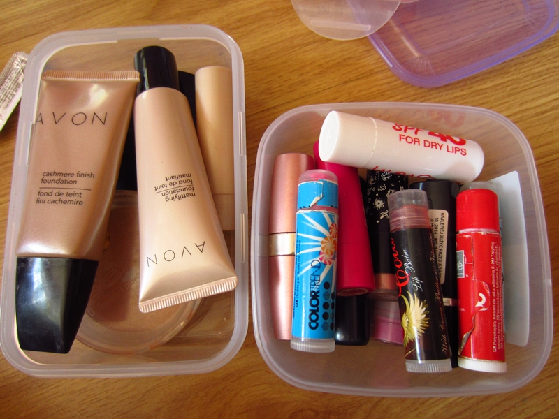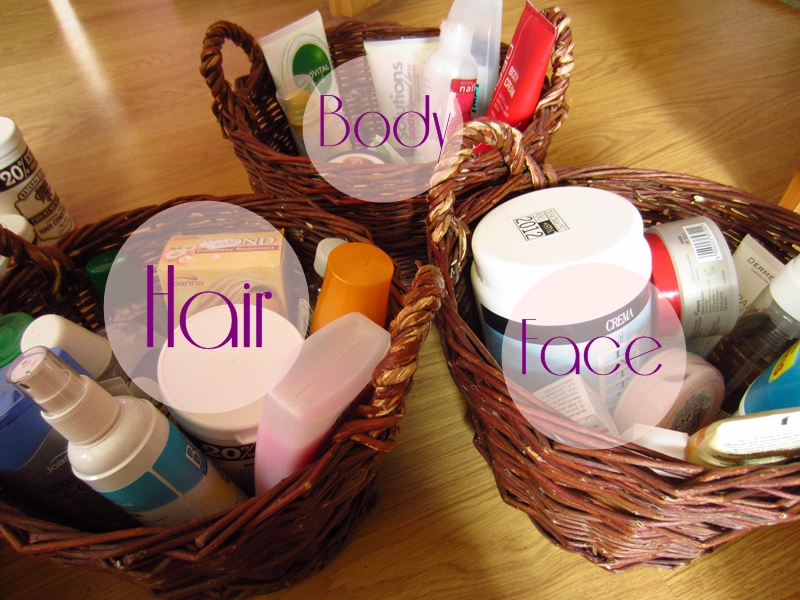 1. Raz na jakiś czas zbieram wszystkie kosmetyki i dzielę na grupy. Zaczynam od pielęgnacyjnych i dzielę je na te do włosów, twarzy i ciała. Następnie wybieram te z których będę teraz korzystać - po jednym, góra dwu przedstawicieli z grupy i te kosmetyki wędrują albo do łazienki - balsam do ciała, żel i peeling do twarzy oraz odżywki - albo do pudełka na biurku - krem do stóp, serum, mleczko, tonik, krem do rąk, krem do twarzy i wszystkie inne kosmetyki które chce mieć pod ręką.