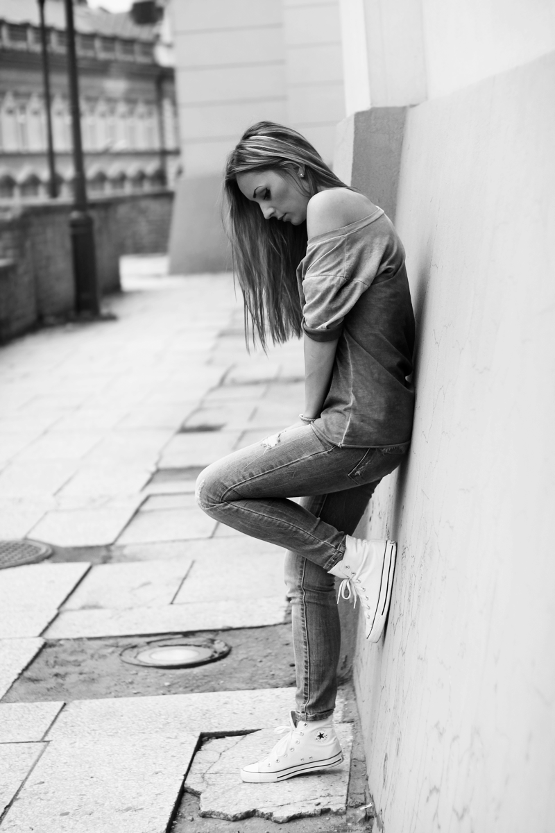 Dziś mam na sobie model od Magic Women w odcieniach popielu, założyłam również moje ulubione jeansy, które służą mi już baardzo długo i nie zamieniłabym ich na żadne inne, podobnie jak białe klasyczne trampeczki.