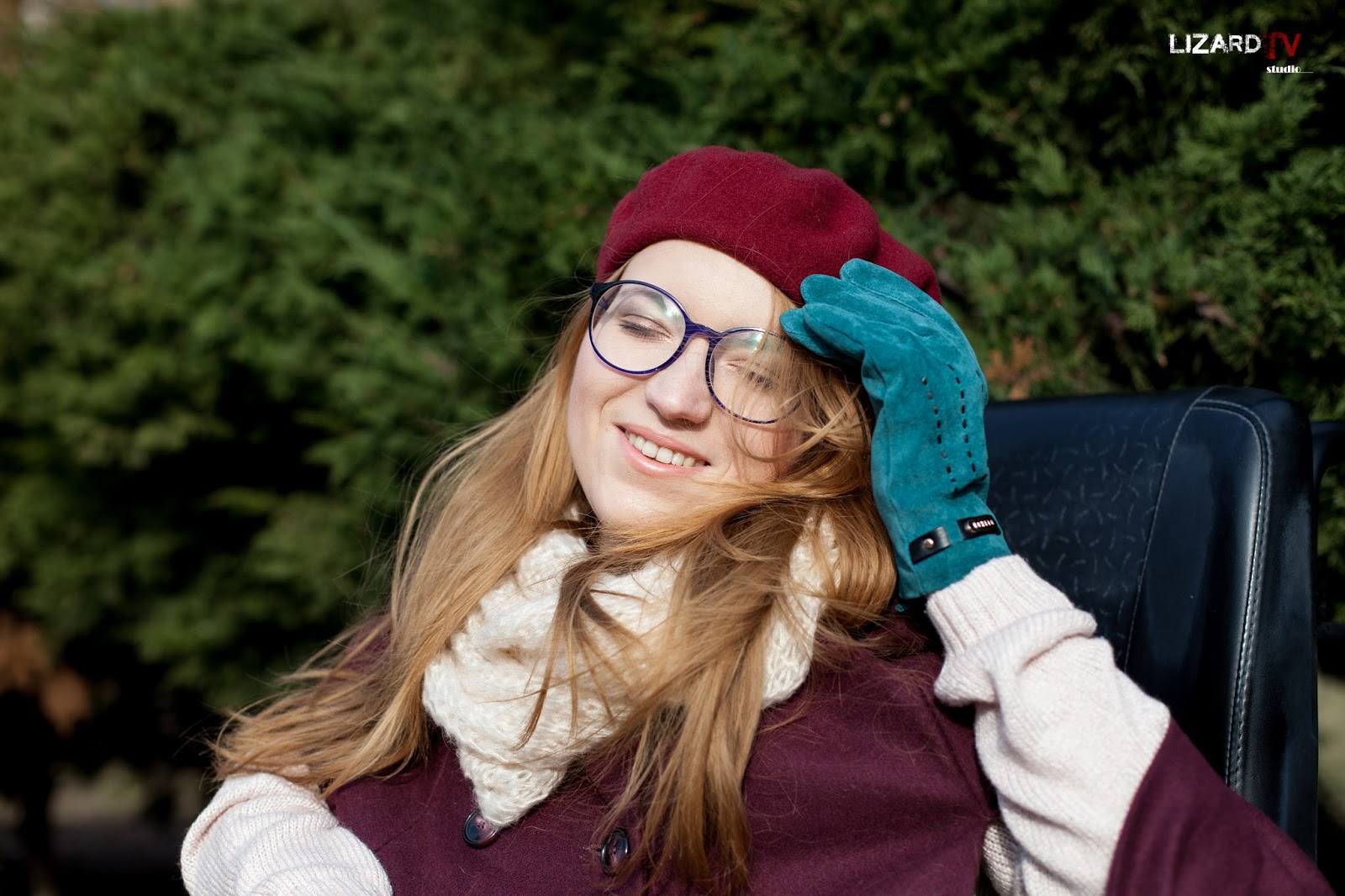 Piszę ten tekst po raz piąty. Kasuję, piszę, kasuję, piszę. Mam wrażenie, że obrazy mówią same za siebie. Inspiracja stylistyką retro była przypadkowa, ale wydaje się być strzałem w dziesiątkę. Kocham nakrycia głowy, a znaleziony na dnie szuflady beret okazał się wyjątkowo twarzowy. Pelerynę już tu widzieliście, tak samo jak buty. Różowy sweterek jest nowością - ostatnio coraz więcej różu gości w mojej szafie. Czarna krótka sukienka i ażurowe rajstopy stanowią fajną bazę dla barw. Zielone rękawiczki chwyciłam tuż przed wyjściem z domu, myśląc o tym, że łapy mi zamarzną, a na czas zdjęć można zdjąć. Jak widać - nie zdjęłam, bo to nietypowe połączenie kolorystyczne skradło moje serce. A okulary są od Firmoo - opisywałam je ostatnio (TUTAJ), dziś prezentuję na mordce. Kontrast miękkich faktur i mocnych dodatków - ćwieki na plecaku czy rockowe buty - być musi!