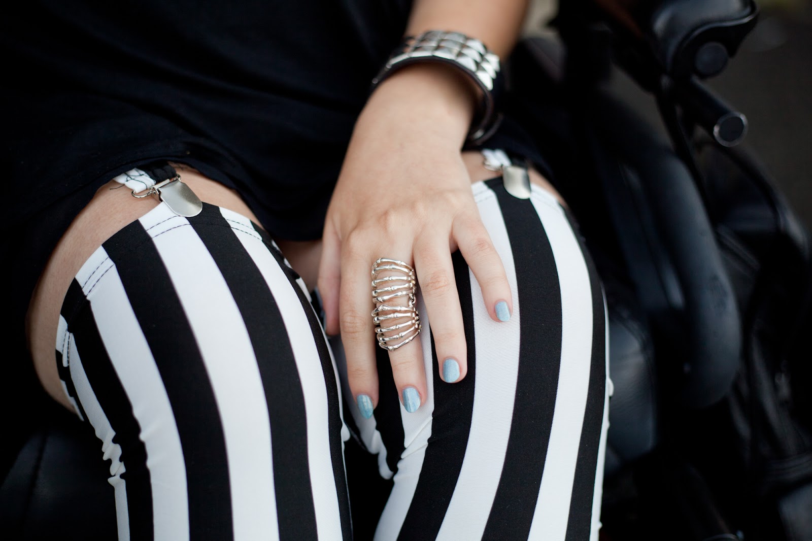 Równie ważne co baza są dodatki: ćwieki i krzyże podkreślają rockowy charakter. Zamiast jednak typowej obroży, wybrałam luźną opaskę z długimi kolcami - ciekawie prezentuje się na co dzień - kojarzy mi się z wakacyjnymi festiwalami. Do tego - masywne buciory! Taaak, doooobra, maaacie rację, nie mogłam sobie odpuścić ;) Na szczęście to model cut-out (taki... powycinany, o!), więc nogi w nich się przesadnie nie grzeją.