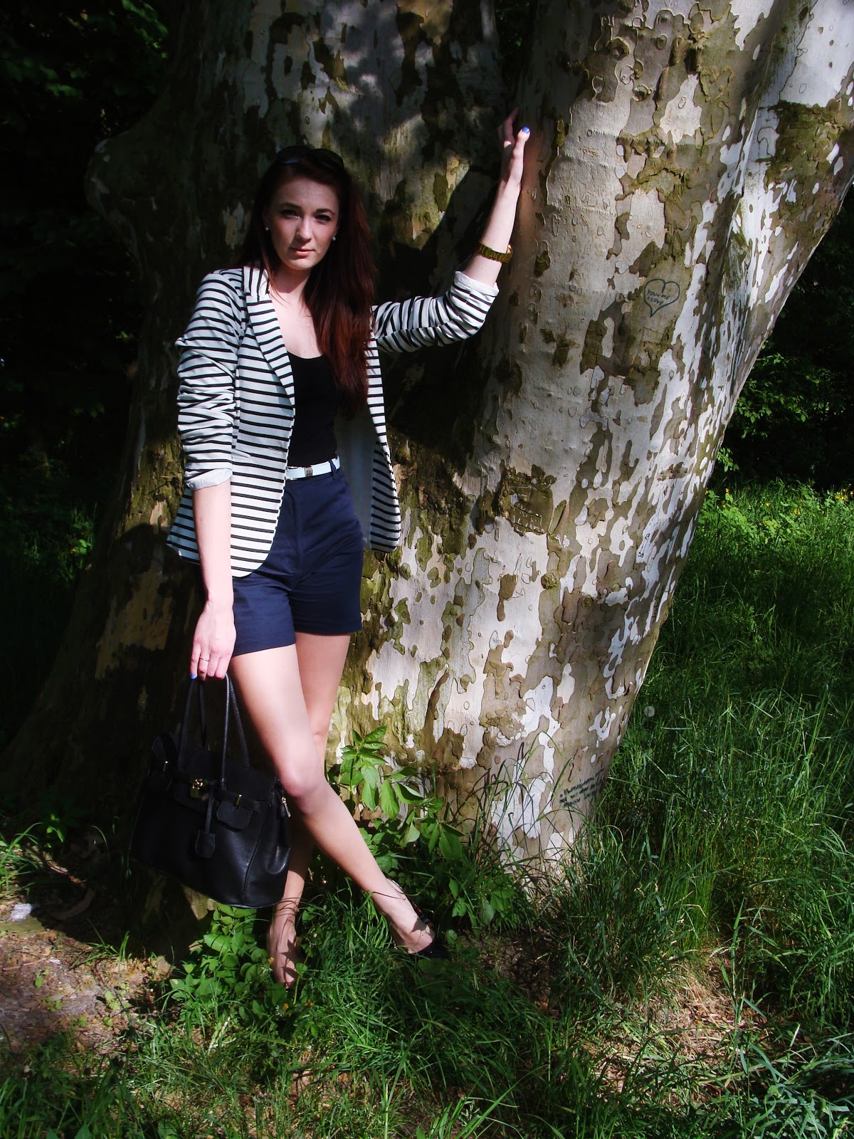 Dzisiaj prezentuję Wam prosty zestaw, w którym główną rolę odgrywa marynarka w paski. Jak wiadomo to jeden z nagorętszyh trendów tej wiosny. Mój blazer udało mi się zakupić w lokalnym sklepie, natomiast granatowe szorty znalazłam w pilskim sh za jedyne 2,30 zł. Zależało mi na tym aby zachować minimalistyczny charakter całej stylizacji, dlatego dodatki ograniczyłam do paska, torebki oraz okularów. Mam nadzieję, że Wam się podoba.