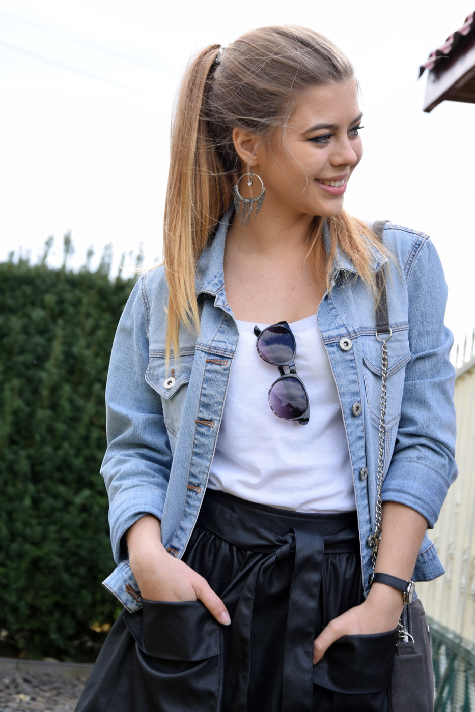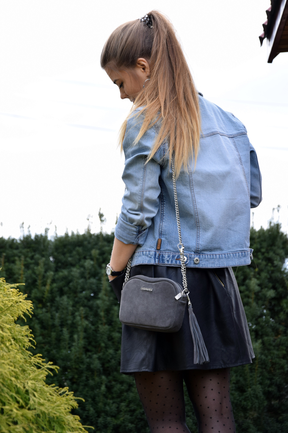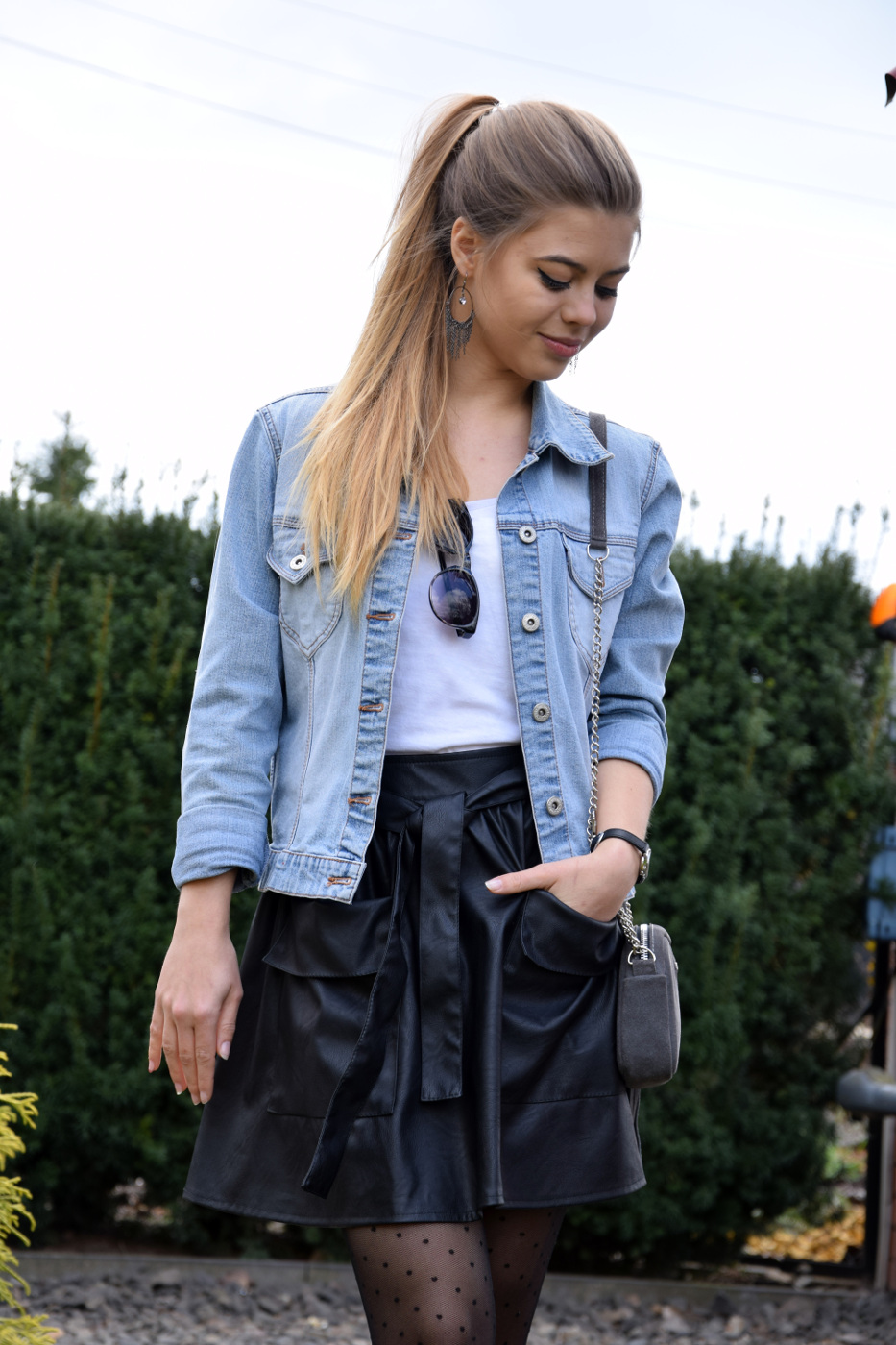 Zobacz oryginał ndz., 02/04/2017 - 15:08Hej Kochani! Dzisiaj prezentuję się Wam w kitce. Na blogu to naprawdę rzadkość :D W ten słoneczny dzień postawiłam na skórzaną spódnicę, którą mogliście już zobaczyć dość niedawno, ale były to zdjęcia w domu (post TU). Jeansowa katana, która widzicie to najlepszy zakup ostatniego miesiąca – kupiłam ją za niecałe 30 zł w Ciucholandzie i jest to marka TOPSHOP. Na pewno w sklepie zapłaciłabym za nią dużo dużo więcej, więc cieszę się, że nie przepłaciłam. W marcu często wybierałam się na łowy do SH i planuję Wam pokazać moje zakupy już za kilka dni w „Podsumowaniu miesiąca” :) Buty mogliście zobaczyć w zestawieniu ze spodnimi (post TU), przez co nie był widoczny pasek na kostce, który moim zdaniem dodaje uroku, więc musiała się tu pojawić ich „nowa” odsłona. Do tego moja ulubiona torebka Fabiola, rajstopy w kropki, skromny zegarek, okulary, bez których już nie wychodzę z domu i kolczyki koła, które ostatnio stały się bardzo modne. Kiedyś bardzo lubiłam takie kolczyki i mam ich całkiem sporo :D Cieszę się, że znowu jest na nie taki szał :) A Wy lubicie ten trend na koła w biżuterii? Dajcie znać w komentarzach :)