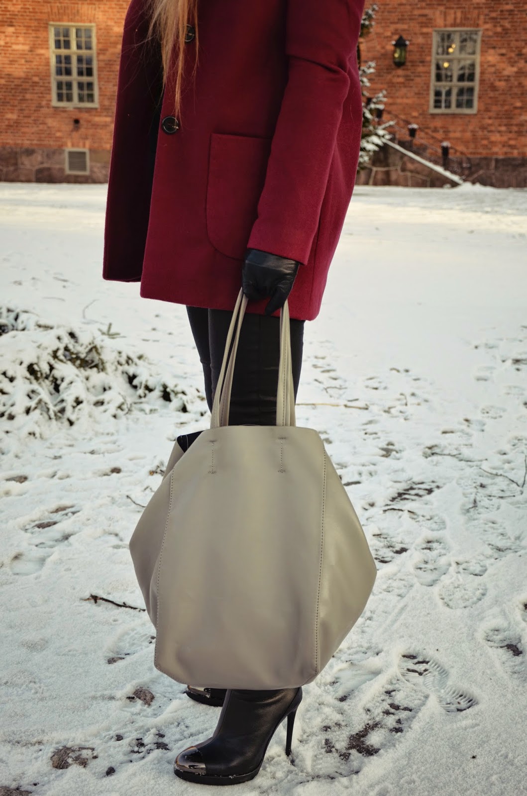 In winter when I don't feel like wearing a thick scarf or when it doesn't look so well with a coat, it's always a great idea to wear a warm wool turtleneck sweater instead. While taking the photos for today's post, it was around -15 degrees and I wasn't freezing. We were just hurrying up to catch some shots before my nose gets red from the cold. As for the colours, the burgundy shade of the coat, that is very trendy this season, adds life to the black and grey colours of the outfit.