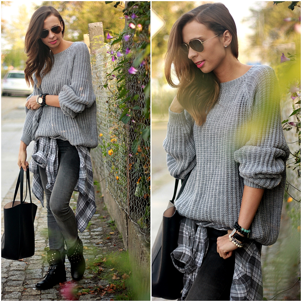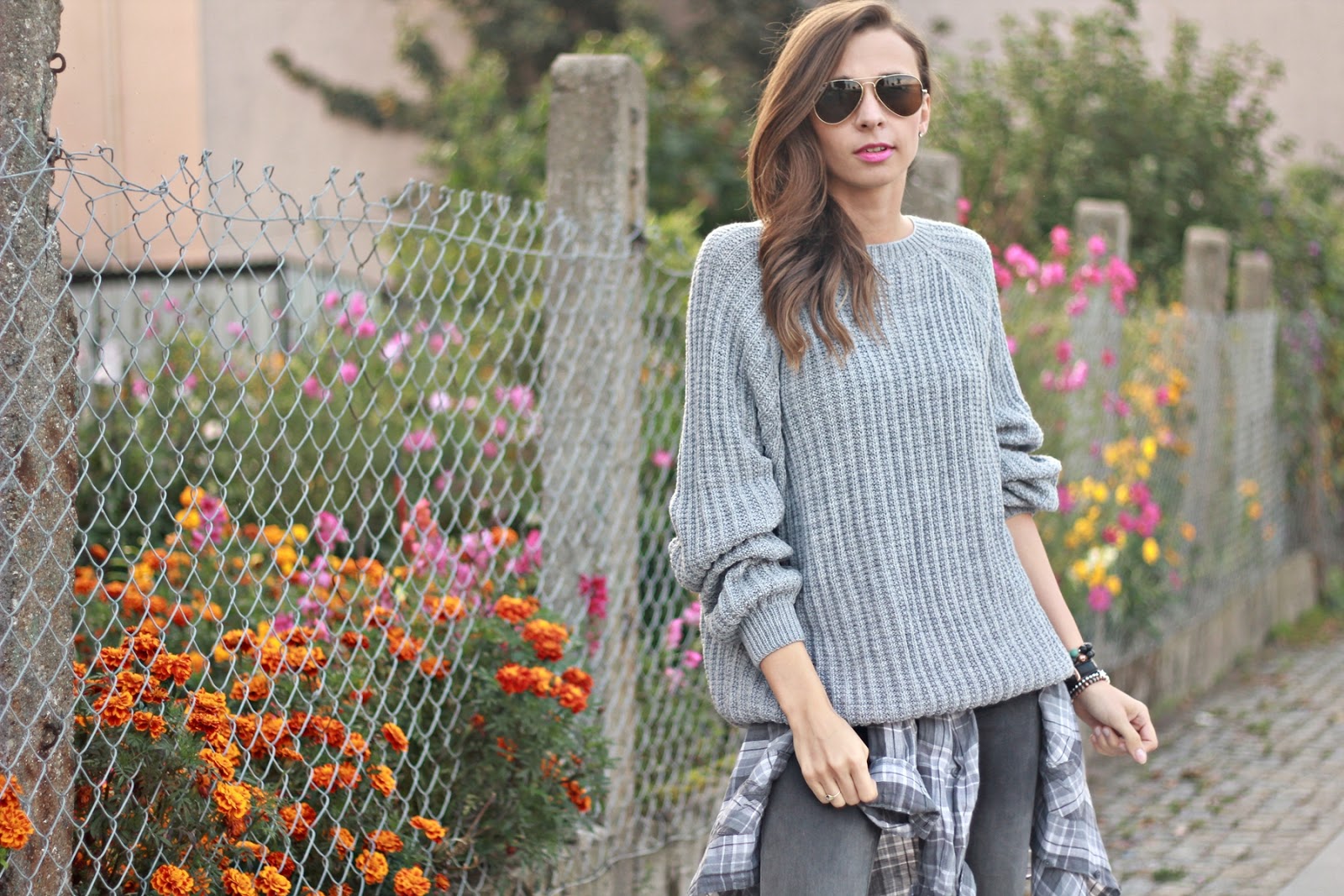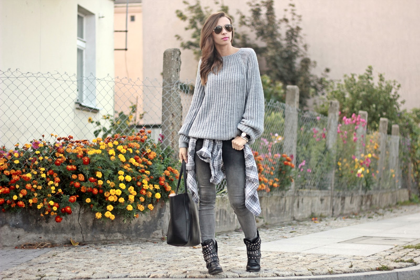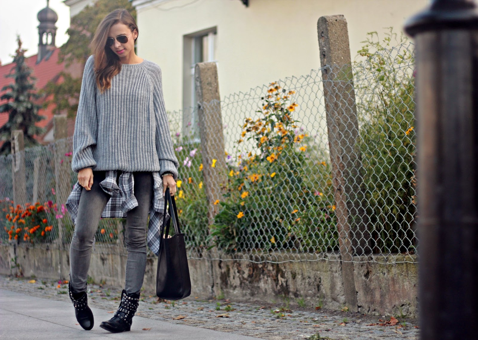 Jeśli chodzi o stylówkę, to kolejny prawie w całości "wygrzebany'' zestaw w second-handzie, którego koszt nie przekroczył 10zł. Oversizowy, szary sweter to mój must have w tym sezonie (tym bardziej się cieszę, że nie przepłaciłam na sieciówkowej propozycji, której cena zupełnie mija się z jakością) do tego szara koszula w kratę i luźny, miejski zestaw gotowy. To lubię!