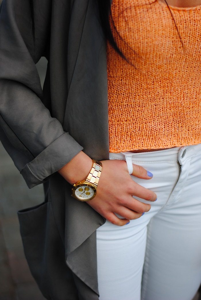 I do not know about you but I always had a problem to find this IDEAL white pants. I've had several pairs but none looked on me as good as I wanted. Believe me that I am very fussy about clothes. Nothing can be see-trough or be too big - unfortunately in my case, to find the right pants with the perfect length is a miracle. So I know that there are different lengths of the legs in different shops, but sometimes it does not even help... As I'm 4working in Zara I have access to many different models of trousers, and with every new delivery I'm trying on everything. . Of course I could not resist to show you them in next post (probably not the last). Because the weather spoiled us this weekend, I added a summer element in the form of kinted tank top in orange. When I was buying it immediately I was thinking about how to combine it with something in my closet but I remembered that I have an orange-olive bag and khaki coat I bought recently and you could see it in the photo on instagram;) I hope you'll like it, I wish you all a great weekend <3