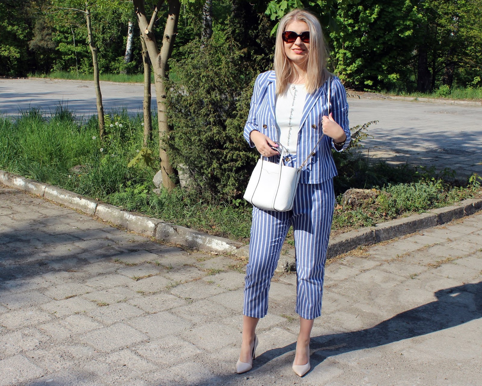 W dzisiejszej stylizacji garnitur! Po raz pierwszy i jako mój pierwszy. Na różowy i czerwony poluję nadal. Ale błękitny w białe paski, z moimi ulubionymi krótszymi nogawkami pasuje idealnie na ciepłe dni. Znalazłam go na SheIn! Lekki, przewiewny i wprost idealny jako look na komunię, a miesiąc maj to dla niektóry miesiąc pierwszych komunii świętych. A pamiętajmy, że jako goście musimy jednak prezentować się odpowiednio. Wykorzystałam do całego look-u białe/kremowe dodatki. Lakierowane czółenka od Gemre świetnie wydłużają stopę.