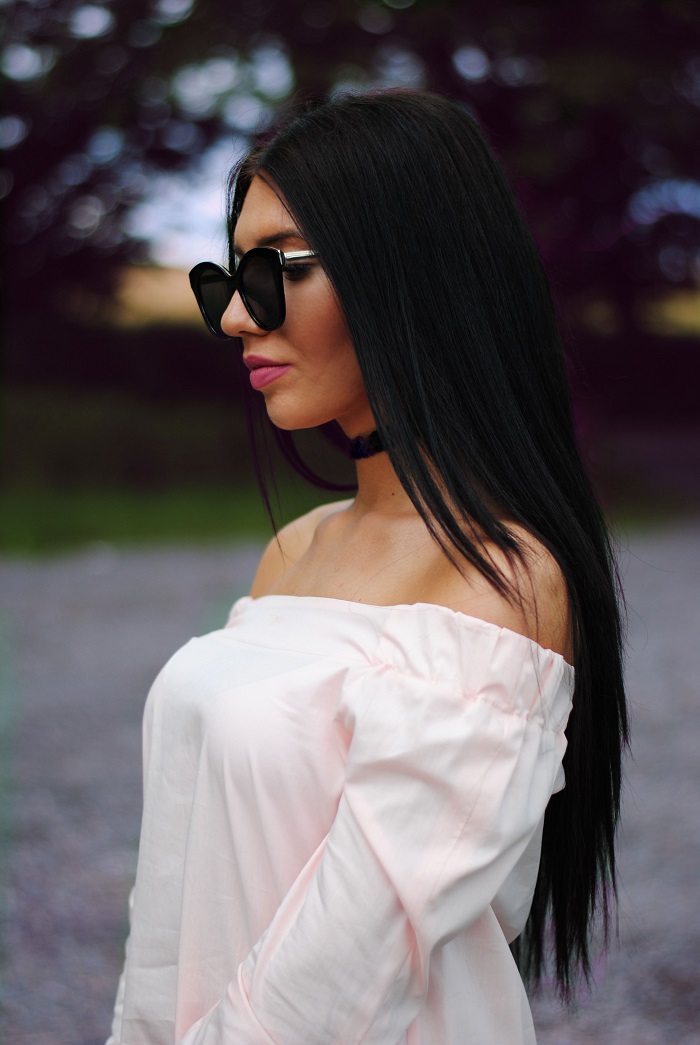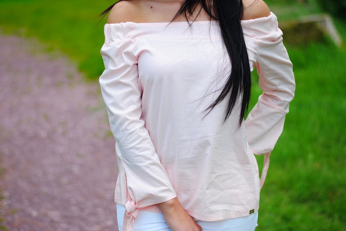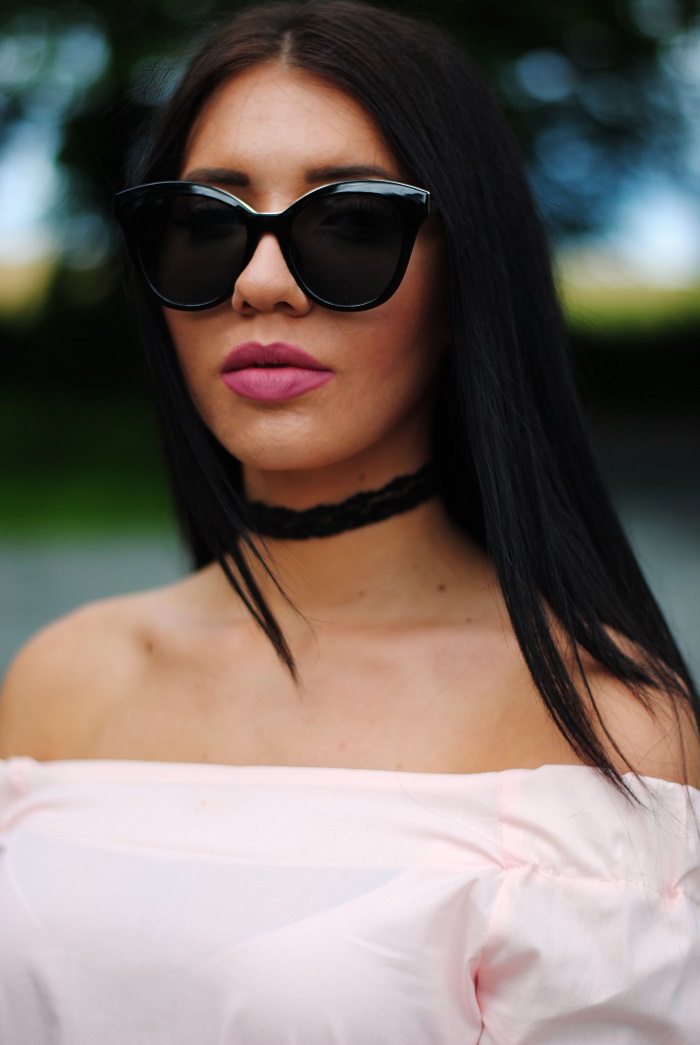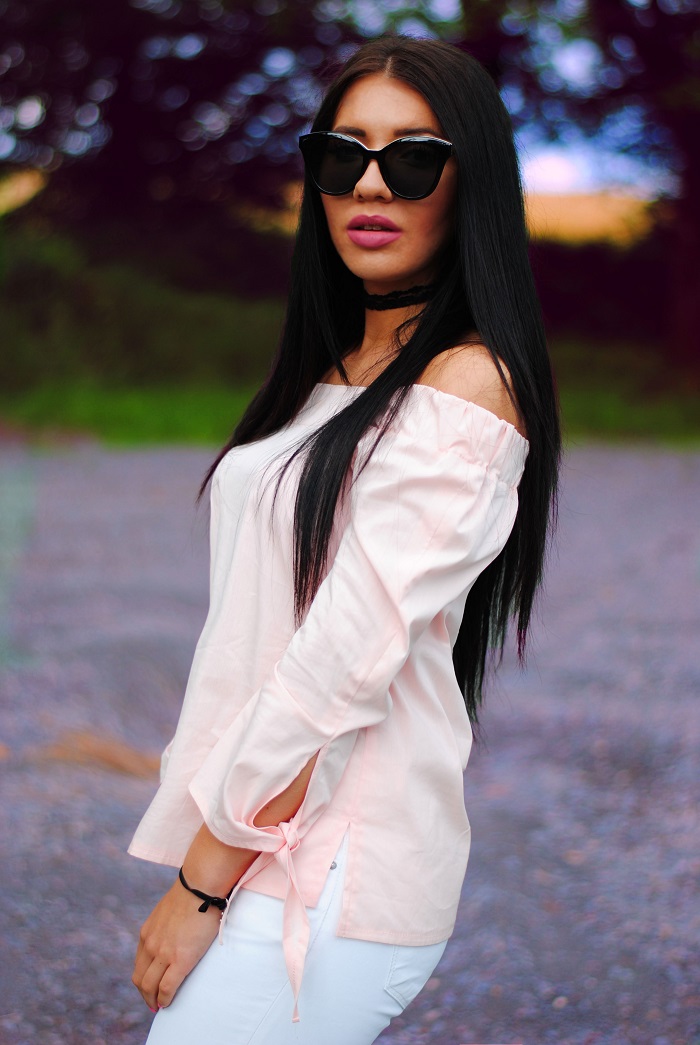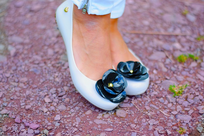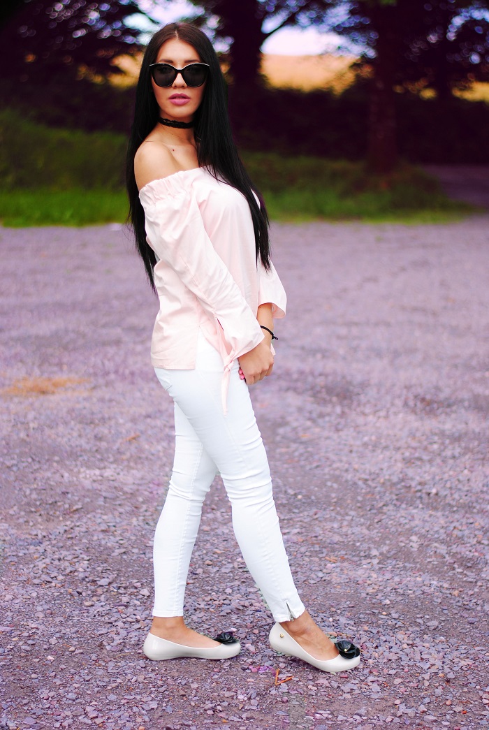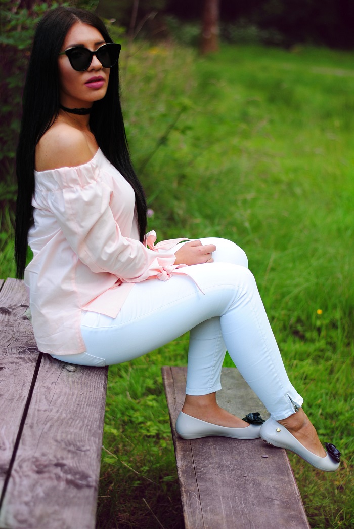 Parę słów o stylizacji, ostatnio jak możecie zauważyć królują w moich stylizacjach kolory! Nie wiem, ale to chyba pora roku sprawia ze mam ochotę mieszać kolory a czerni unikam jak ognia. W dzisiejszej stylizacji postawiłam na połączenie bieli i pudrowego różu. Stylizacja jest bardzo dziewczęca i szykowna. Kocie okulary oraz czarne kwiatki na balerinach od razu kojarzą mi się z Chanel. Szczerze mówiąc miałam ze sobą swoją czarna torbę Michael Kors, jednak na zdjęciach wyglądała ona zbyt ciężko do całej stylizacji. Może teraz kilka słów o meliskach, buty gumowe, wydawało by się że nie są zbyt praktyczne na lato, jednak ja nie narzekam i na prawdę jestem w nich zakochana! Dość długo wybierałam te idealne, ze względu na to że jest tak duży wybór, lecz w końcu znalazłam te idealne. Pierwsza rzecz która mnie urzekła to ich zapach, jest on uzależniający. Do tego są oczywiście bardzo wygodne i wbrew pozoru nie obcierają stóp ! Więc jeśli szukacie fajnych balerinek na lato z całym sercem polecam wam Mel by Melisa. Jak podoba wam się takie połączenie?