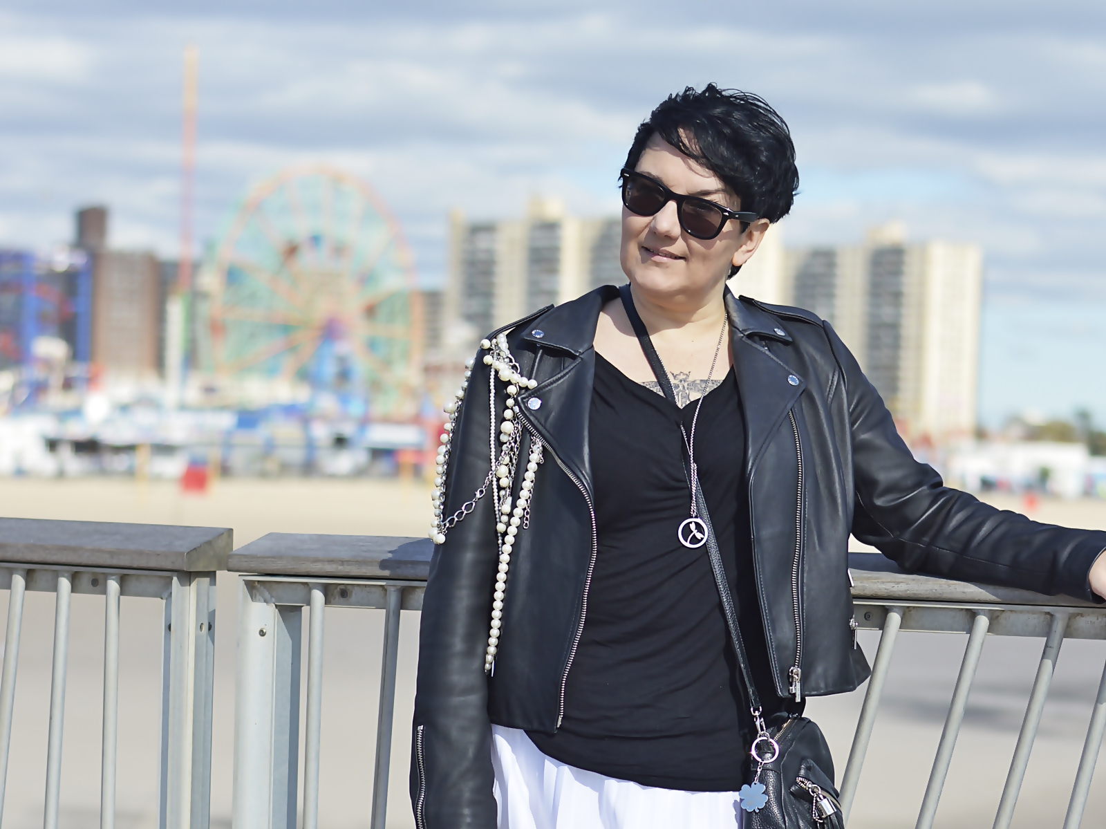Tę spódnicę pokazywałam już na moim blogu; dzisiaj w lekko rockowej ( skórzana ramoneska i skórzane, cięższe buty ), a lekko eleganckiej ( perły ) odsłonie.