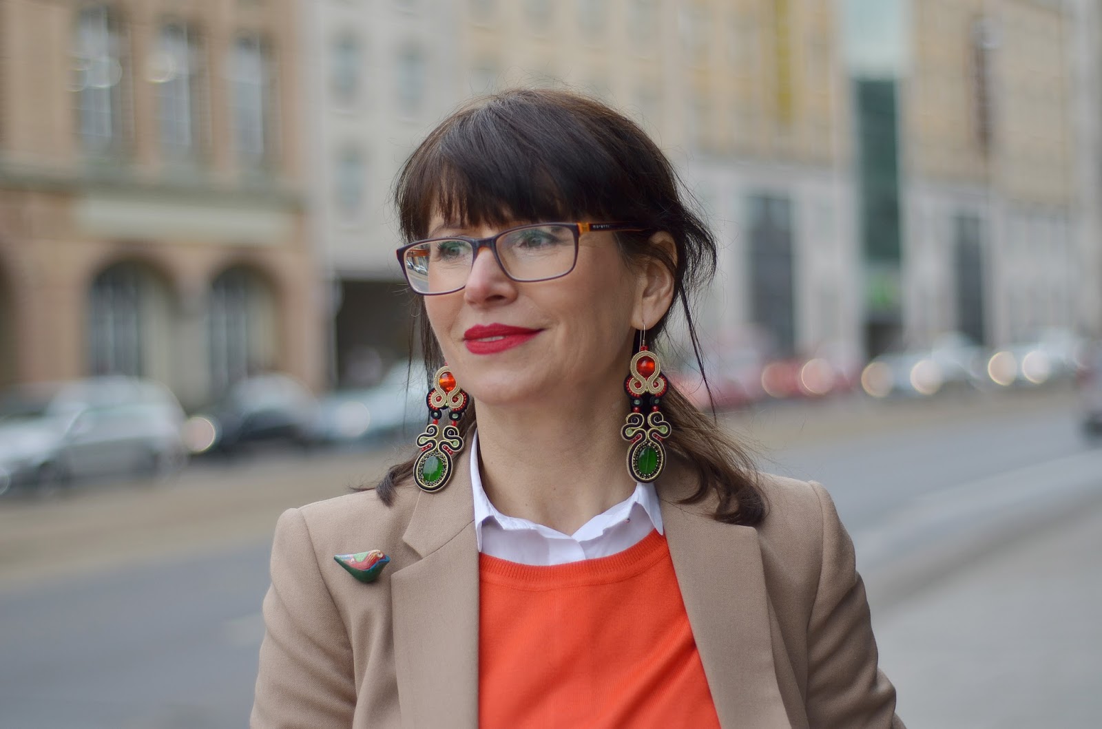 Dłuższa, biała koszula to teraz bardzo chętnie wykorzystywany element stroju, u mnie "gości" już drugi rok i zawsze mam na nią pomysł ;) Dzisiaj jest takim tłem, bo pomarańcz z beżem mógłby wyglądać za mdło a tak podkreśla kolory. Do tego nadaje całej stylizacji takiego świeższego wizerunku. Całość ozdobiłam kolczykami, które nie potrzebują dodatkowej "oprawy" :) Dobrze też "dorzucić" do całości jakiś fajny kolor na usta. Ostatnio bardzo polubiłam maty, najlepsze, moim zdaniem, ma firma M.A.C. Jeśli ktoś, tak jak ja, polubił matowe szminki, to polecam tę firmę :)