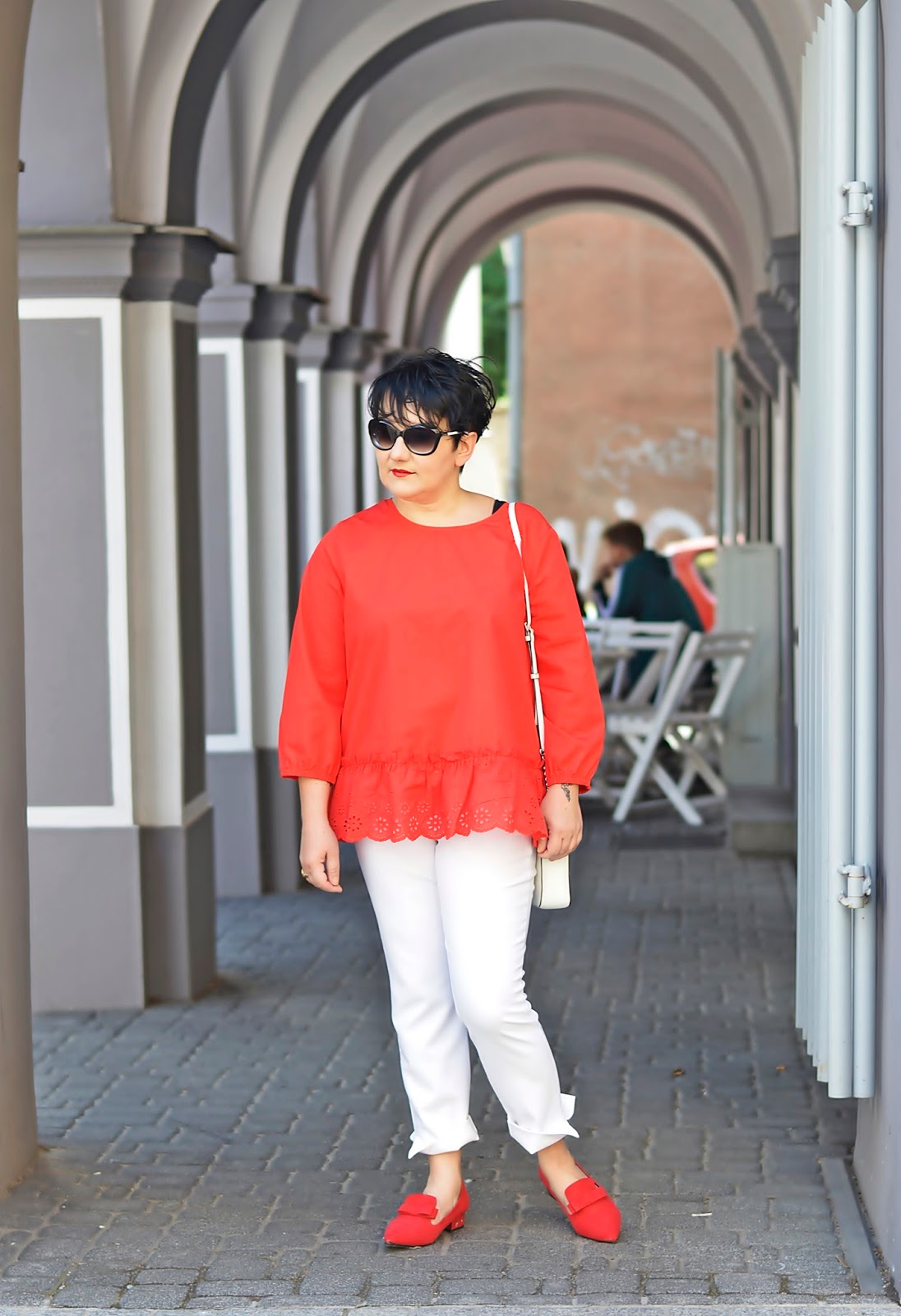 Białe spodnie cygaretki i bawełniana bluzka z haftami tworzą duet idealny na lato. Czerwone buty na obcasie dodały szczyptę elegancji. Można by je z powodzeniem zastąpić półtrampkami i tak wybrać się na zwiedzanie małego, urokliwego miasteczka, np na południu Francji.