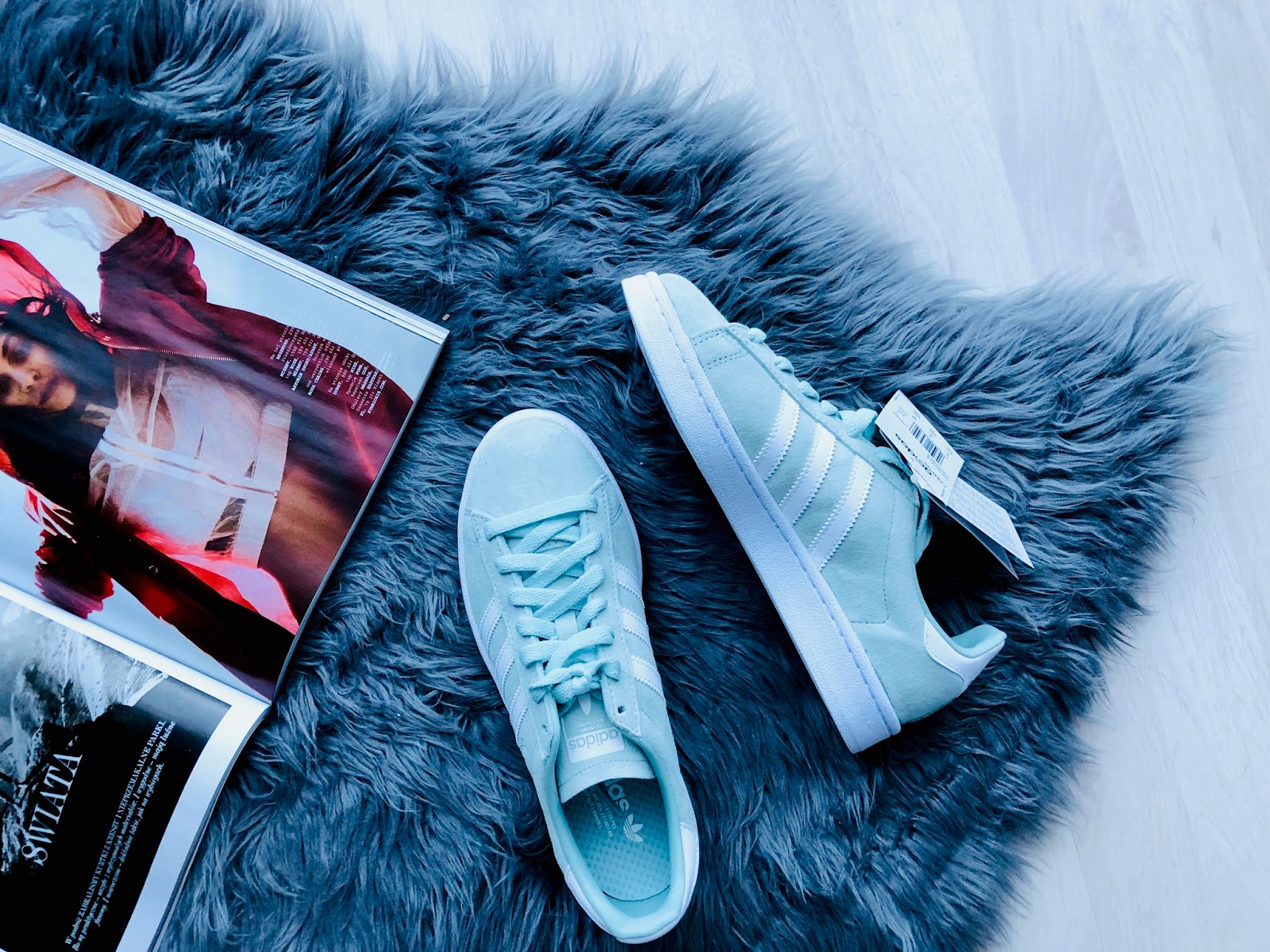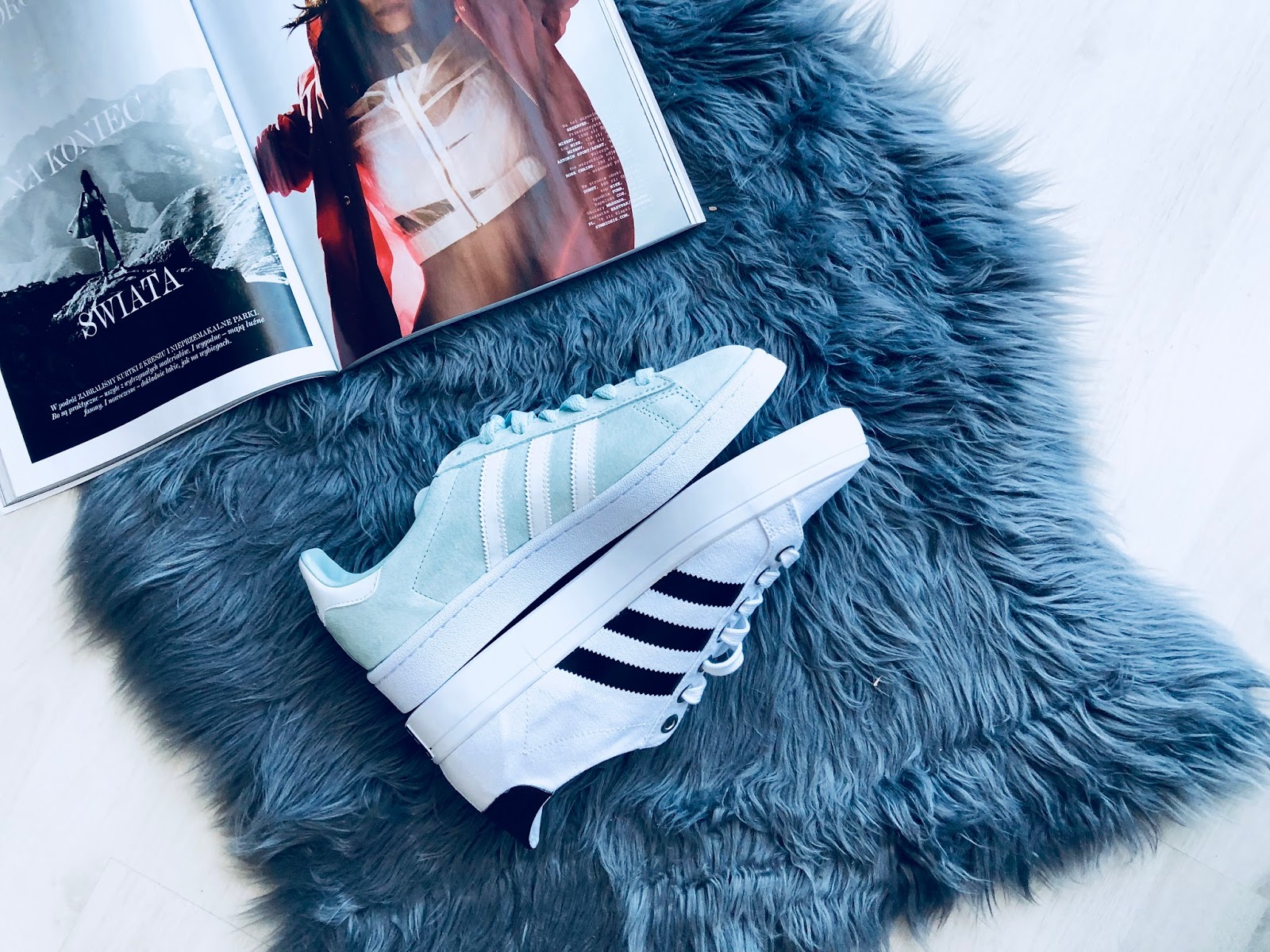 Początkowo miałam ochotę na nowe trampki, bo w nich czuję się najlepiej. Chwile później uświadomiłam sobie, że jestem mamą więc muszę zachować odrobinę powagi, a Conversy kupione w zeszłym roku trzymają się całkiem nieźle. Wybrałam się więc na bardziej klasyczne buty - Adidas Campus w pięknym miętowym kolorze ( Ash Green ). Gdzieś słyszałam, że pastele będą hitem tej wiosny więc idealnie wpisuję się w ten trend.