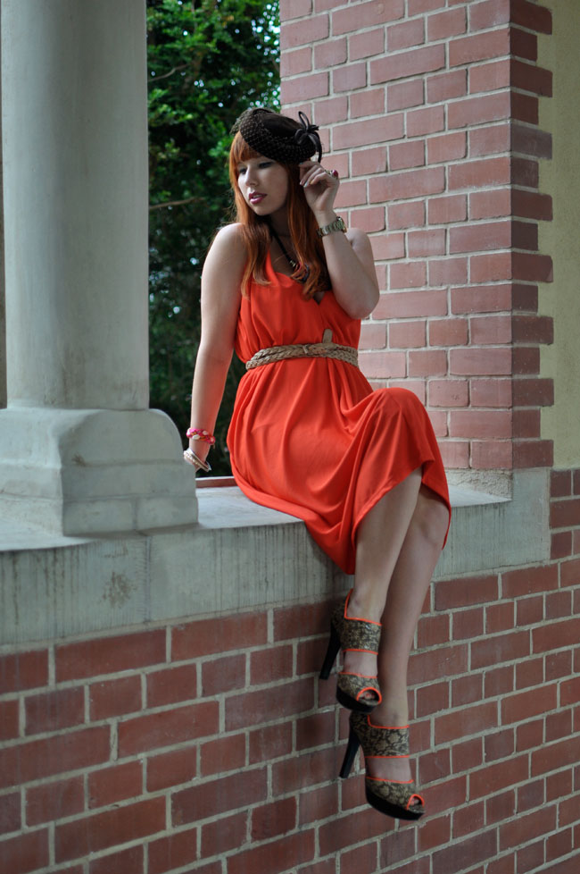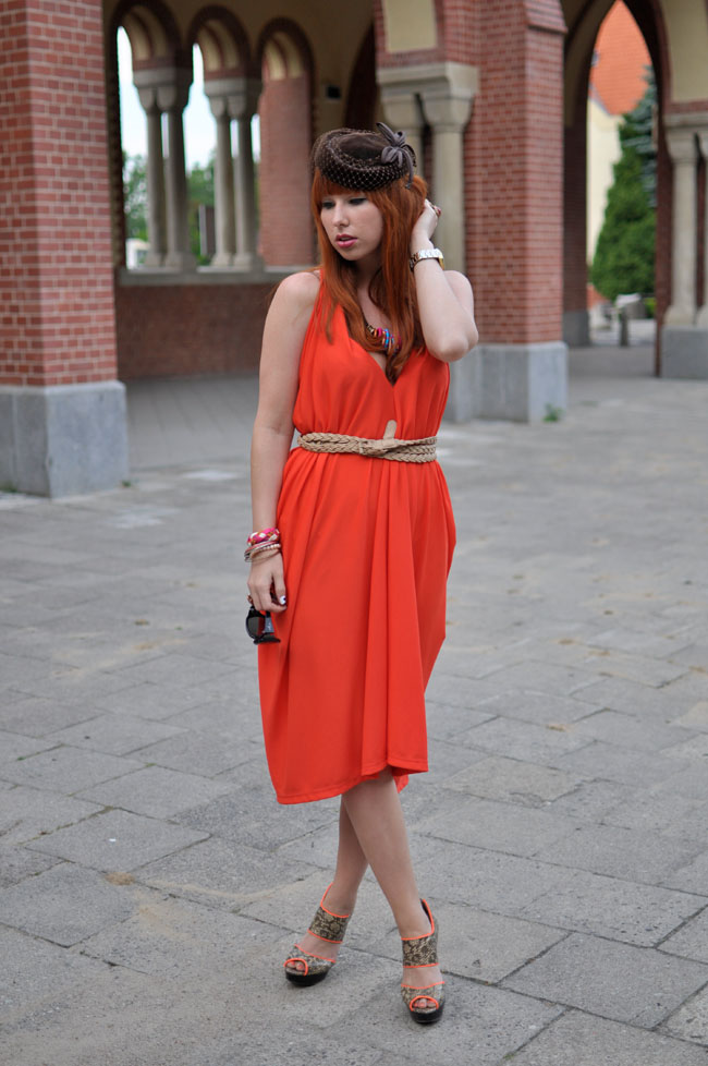 Zobacz oryginał ndz., 28/07/2013 - 22:02W mojej szafie gości zdecydowanie więcej spodni niż sukienek. Co nie znaczy, że ich nie lubię. Nic z tych rzeczy! Uwielbiam sukienki! Cenię jednak te, które mają różnorakie zastosowanie. Kiedyś sukienki szybko mi się nudziły, ponieważ za każdym razem gdy je zakładałam, wyglądałam tak samo. Nic nowego... Ten sam krój, wzór, kolor... Dlatego od pewnego czasu zaczęłam kupować tylko takie sukienki, które można wykorzystać na kilka sposobów lub wzorzyste, by pasowały do wielu rzeczy. Tak też było z tą kiecą. Zakupiona w ciucholandzie za kilka złotych, mogliście ją już zobaczyć TUTAJ:) Tym razem postanowiłam przepasać ją plecionym paskiem i dodać brązowe akcenty. Trencz wydał mi się idealnym towarzystwem dla babcinego toczka. Wspólnie dodały nieco poważniejszego tonu całej stylizacji. Obyło się bez szaleństw, a w centrum zainteresowania jest ONA, Pomarańczowa Ekscelencja. ;)