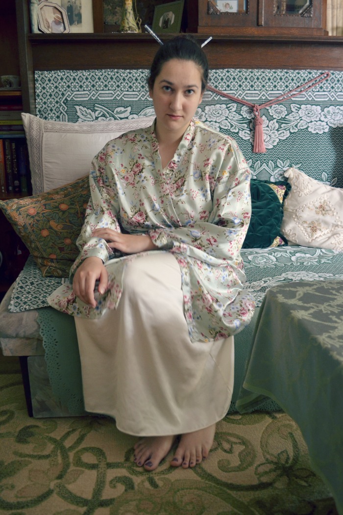 Bardzo lubię spędzać ten szczególny czas w stroju, który podkreśla domową, leniwą atmosferę i wywołuje u mnie odczucie niespieszności, a więc nieodzownym elementem poranka jest dla mnie koszula nocna ze szlafrokiem. Muszę jednak przyznać, że spanie w koszuli jest dla mnie średnio wygodne, dlatego z reguły wybieram piżamy, a kilka koszul nocnych jakie posiadam, pełni rolę takich odzień pomiędzy piżamą, a strojem domowym. Wiem, to skomplikowane.