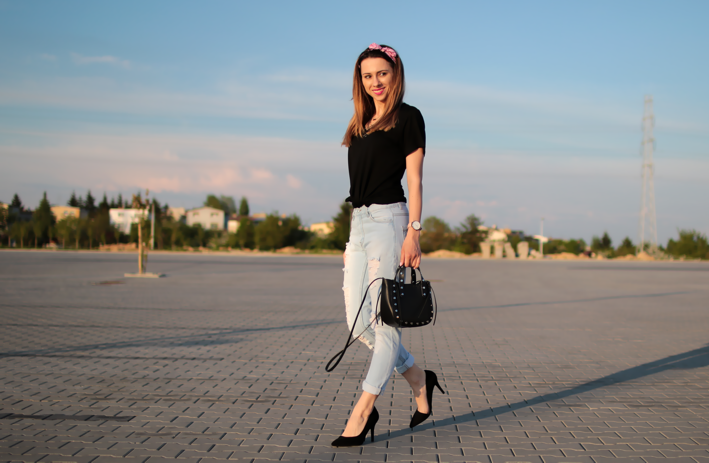 Co do stylizacji - dziś bardzo prosto - klasyczne połączenie jeansowych boyfriendów, czarnego t-shirtu i asymetrycznych szpilek. Jedynym "szalonym" akcentem jest różowa bandana, która muszę przyznać mocno przyciągała wzrok mijających mnie osób ;) T-shirt nieco przydługi, więc zawiązałam u dołu supeł, ale jakość zaskakująco dobra. Więc jeśli szukacie takiej - jak to mówią - "bejzikowej" koszulki to tę mogę Wam polecić ;)