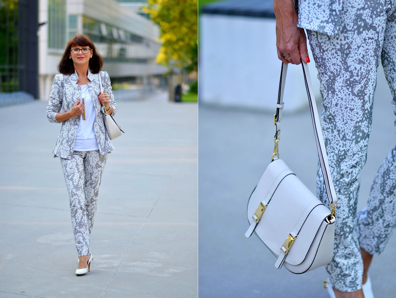 Stylizacja: garnitur w bardzo ciekawy print, tylko dwa kolory ale nie sposób go nie zauważyć. Perfekcyjnie skrojona marynarka, z idealnie wyprofilowanymi ramionami co jest teraz bardzo istotne, ciekawymi klapami oraz lekko rozkloszowanym dołem i nieco wydłużonym tyłem, pięknie podkreśla talię. Do tego już proste wręcz ascetyczne spodnie. "Ascetyczne" bo nawet kieszeni nie mają :D Całość jest tak spektakularna, że nic więcej nie trzeba, wystarczy biała, trykotowa bluzeczka, albo uwielbiany przez Maję Sablewską, t-shirt i poczujesz się jak gwiazda ;)