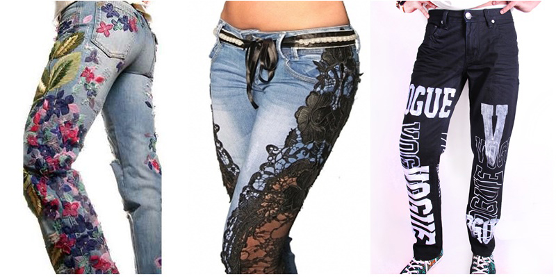 Inną "ozdobą" jeansów, której osobiście na żywo nie widziałem (dzięki Olga za podpowiedź) są hafty na nogawka. Występują one najczęściej na spodniach dziecięcych. W takich przypadkach jest to jak najbardziej dopuszczalne i urocze. Jaka mała dziewczynka nie chciałaby mieć na swoich malutkich jeansach wyhaftowanych kwiatków lub motylków? A co powiecie na takie hafty na nogawkach spodni dorosłej kobiety? Żeby było ciekawiej to co powiecie na koronkę na jeansach? Podejrzewam, że efekt miał być seksowny a wyszło jak Szydło z worka...