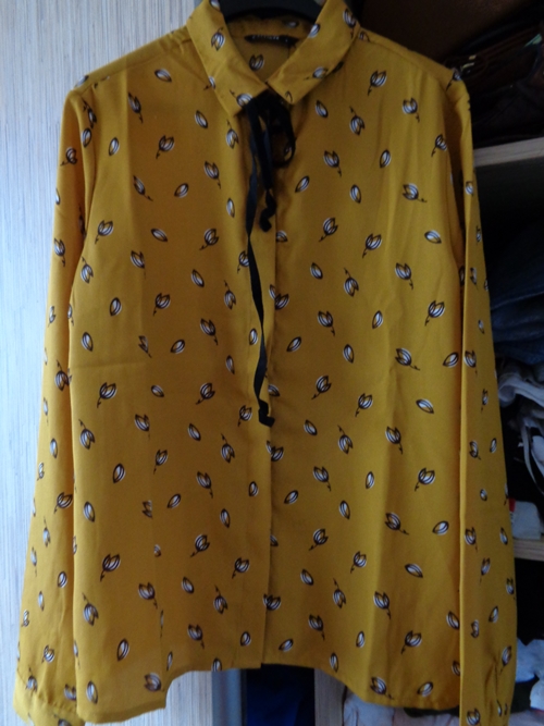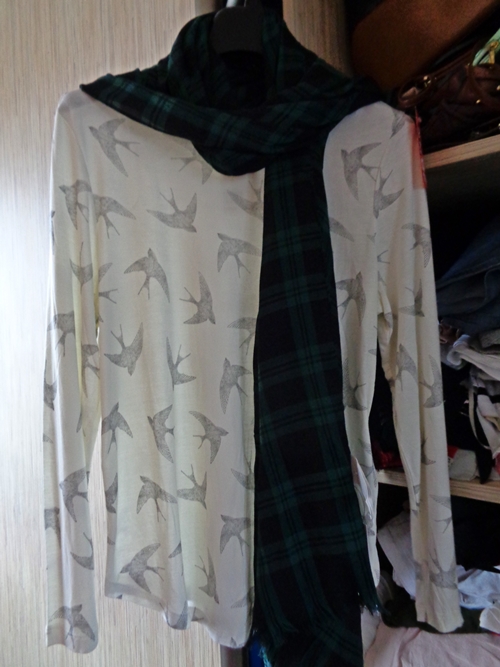 Z tego drugiego pochodzi urocza, trochę piżamowa bluzeczka w jaskółki w cenie 20 zł. Na niej mamy szal z outletu Calliope w cenie 3,90 zł.