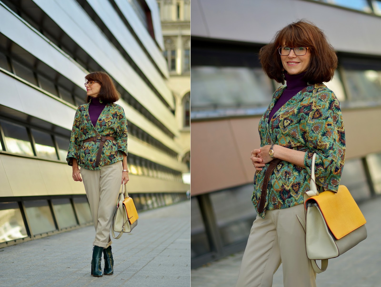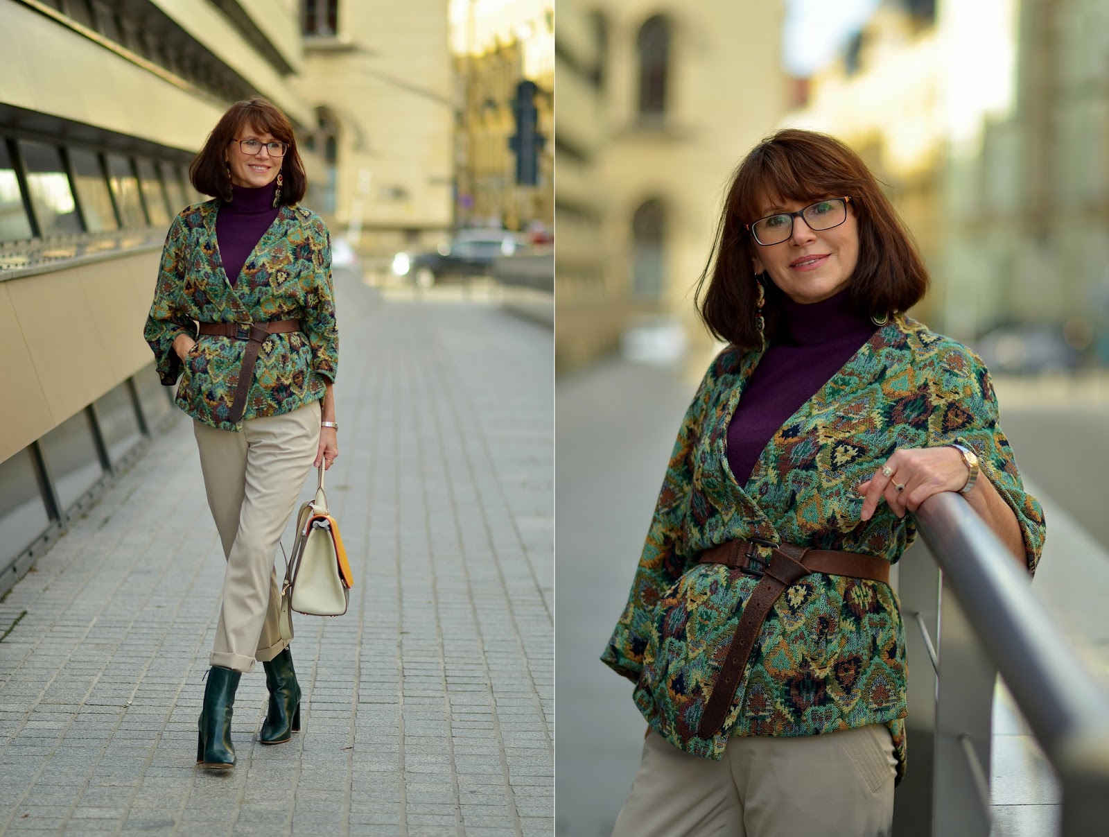 Stylizacja: zdjęcia robiłyśmy jak pogoda było jeszcze dość ładna dlatego wystarczyła kurteczka ;) A ponieważ materiał ma w swoim składzie sporo wełny więc jest dość ciepła. Podstawą stylizacji były jasno-beżowe spodnie i fioletowy, wełniany golf. Zielone botki dopasowałam do kurtki albo odwrotnie, kurtkę dopasowałam do botków, już nie pamiętam ;) Grunt, to ma pasować i pasowało:)