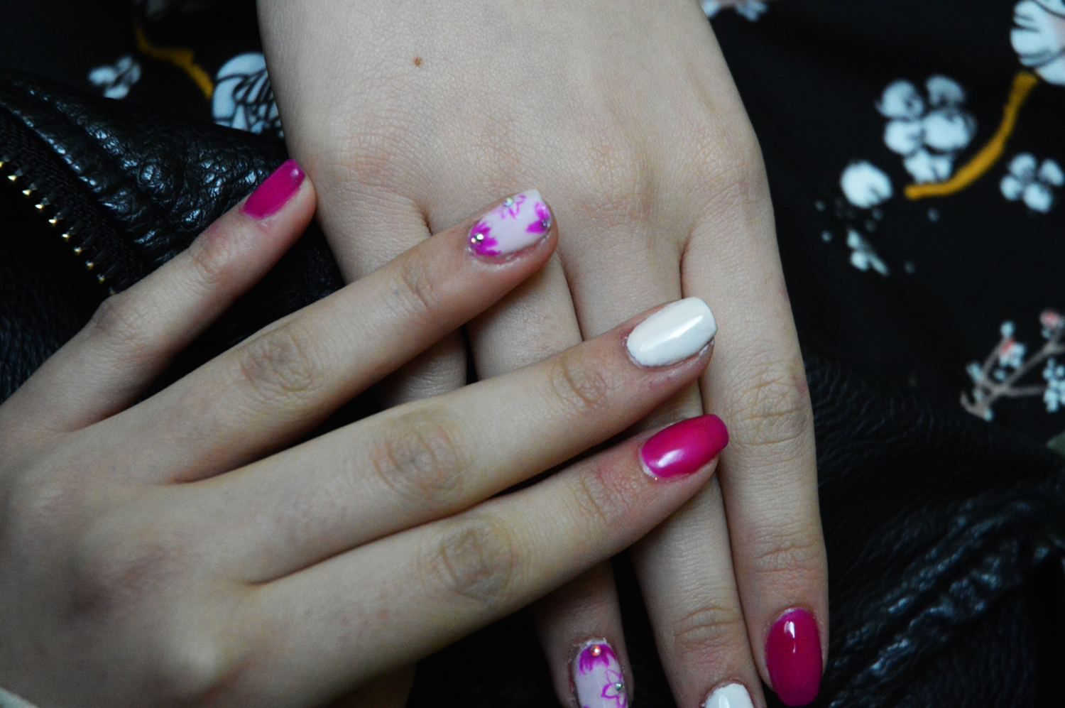 Pora na najważniejszy element czyli kwiatki. Z pozoru łatwe zdobienie w praktyce było kilka poprawek i co chwilę szło coś nie tak. Lakierem bazowym jest niezastąpiony Biscuit. Kwiatki malowałam pędzelkiem i użyłam hybrydy Mardi Gras. Zdecydowałam, że najlepszym dodatkiem będą kryształki i faktycznie spisały się świetnie, co więcej trzymały się bardzo długo.