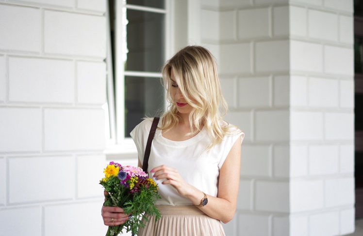 Ja i spódnica midi. To nie była łatwa relacja. U kogoś wyglądała pięknie i stylowo. U mnie jak stara maleńka. A to babciny fason, a to plisy układają się nie tak jak trzeba. Ciągle coś mi nie pasowało. Problem tkwił długości, która trochę do mnie nie przemawiała. Odkąd pamiętam wybierałam krótsze spódniczki i spodenki. A jeśli już coś dłuższego to maxi. Ale midi? Dziwna długość. Jednak podczas wyprzedaży zrobiłam mały przegląd tego typu spódnic. Stwierdziłam, że to dobry moment na zrobienie kolejnego podejścia. Ceny są dużo niższe, co sprawia, że łatwiej mi podjąć ''modowe ryzyko''. I tak w moje ręce trafiła pudrowa spódnica midi z Zary. Piękne połączenie materiałów, kobiecy krój i delikatne plisy. Spróbowałam i nie żałuje! Co więcej już rozglądam się za kolejnym modelem. Wygoda i kobiecość to najlepsze określenia. Czasem warto spróbować nowych rozwiązań.