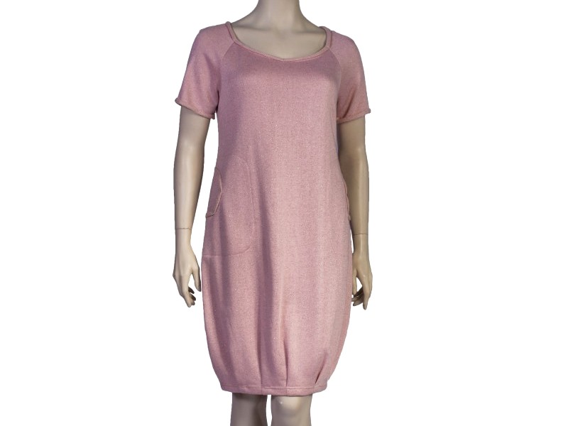 Uszyta jest z dzianiny z lekkim połyskiem, ma kieszenie i ciekawie wykończony dół.