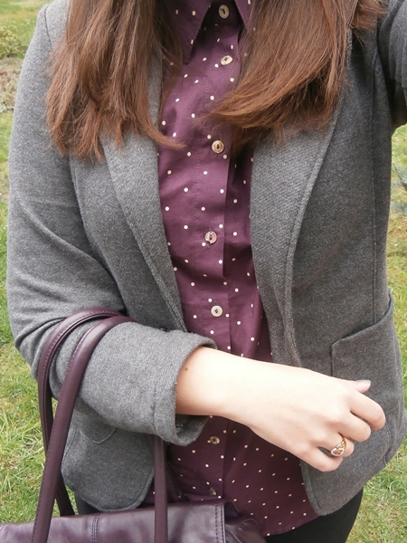 Ja dlatego właśnie postawiłam ostatnio na fiolet. Jest mniej oczywisty :) Gdy zobaczyłam tę śliczną koszulę bez rękawów wiedziałam, że musi być moja. Zdecydowanie przekonały mnie kropki i zapięcie pod szyję. No i cena - załapałam się na zniżkę -40% i dzięki temu mam nową koszulę jeszcze z metką za 11zł :) Torebka pochodzi z tego samego sklepu.