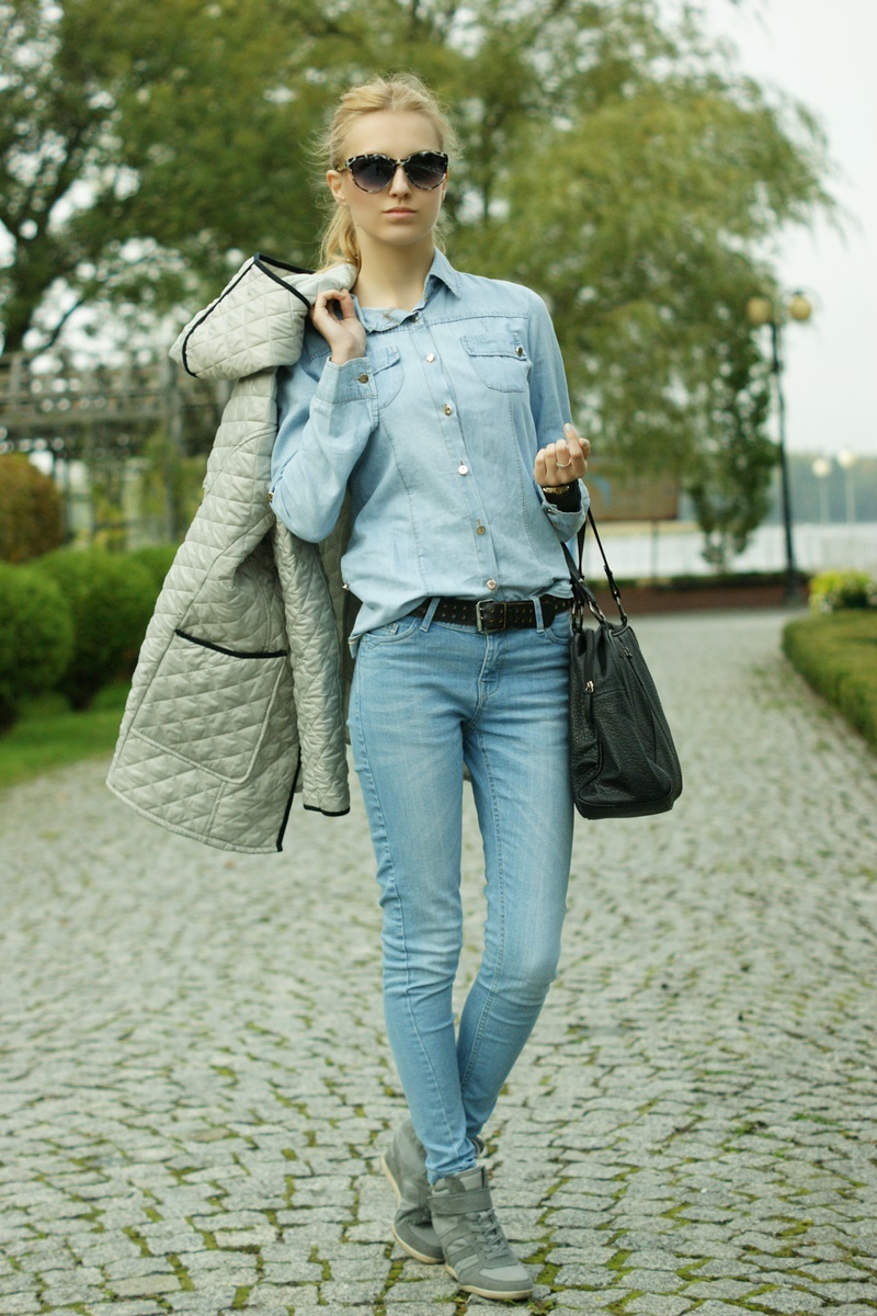 Zobacz oryginał czw., 02/10/2014 - 13:12 Uwielbiam jeans! Spodni z tego materiału mam najwięcej, choć ograniczam się do kilku ulubionych par. Do dzisiejszej stylizacji wybrałam jedne z nich - jasne rurki, które połączyłam z jeansową koszulą w podobnym kolorze. Głównym elementem stylizacji jest pikowany płaszcz w jasnym kolorze od firmy METKA. Jest niezbyt gruby, przez co idealnie sprawdza się podczas jesiennych spacerów. Wiele płaszczy i kurtek nie posiada kapturów, co jest dla mnie zdecydowanym minusem. Ten płaszcz jest jednak wyposażony w duży kaptur, który świetnie ochroni nas przed wiatrem, gdy zapomnimy o czapce oraz deszczem - na wypadek braku parasola. Moja stylizacja jest stylizacją codzienną. Żeby było wygodnie założyłam wysokie adidasy, sięgnęłam po czarną torbę na ramię i okulary z ozdobnymi zausznikami. :)