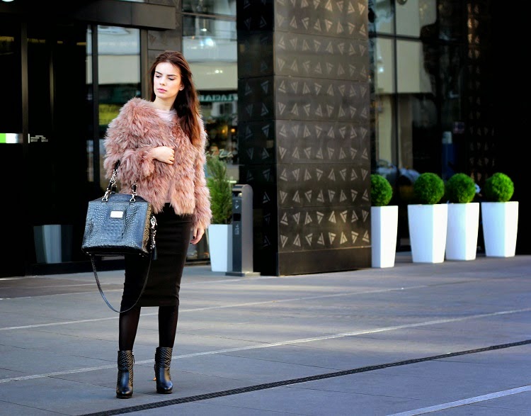 Zobacz oryginał śr., 12/11/2014 - 22:06Dzisiejsza stylizacja z różowym futrem Luisa Cerano to moja wariacja na temat biurowych dress code'ów. Futro niewątpliwie gra tu "pierwsze skrzypce", nie znaczy to jednak, że po jego ściągnięciu jest nudno. Zestaw jest z jednej strony prosty i klasyczny, a z drugiej zas mam nadzieję, że widać, iż ewidentnie postawiłam na grę fakturami i materiałami, a także detalami, jak chociażby pikowane botki, czy ciekawe rozcięcie klasycznej ołówkowej spódnicy, które złączone jest elastyczną siateczką.