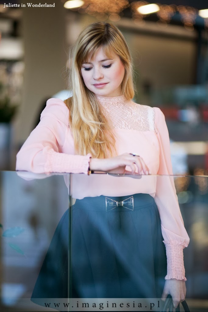 Zobacz oryginał wt., 10/12/2013 - 18:21Deszczowa pogoda nie sprzyja sesją zdjęciowym dlatego stylizacja została sfotografowana w centrum handlowym, przynajmniej nie marzłam podczas zdjęć :) Przepiękną jasno - różową koszulę połączyłam z czarną spódniczką i czarno złotymi dodatkami. Założyłam modne w tym sezonie czarne buty ze złotym zamkiem, czarny pasek ze złotą kokardką i czarną torebkę.