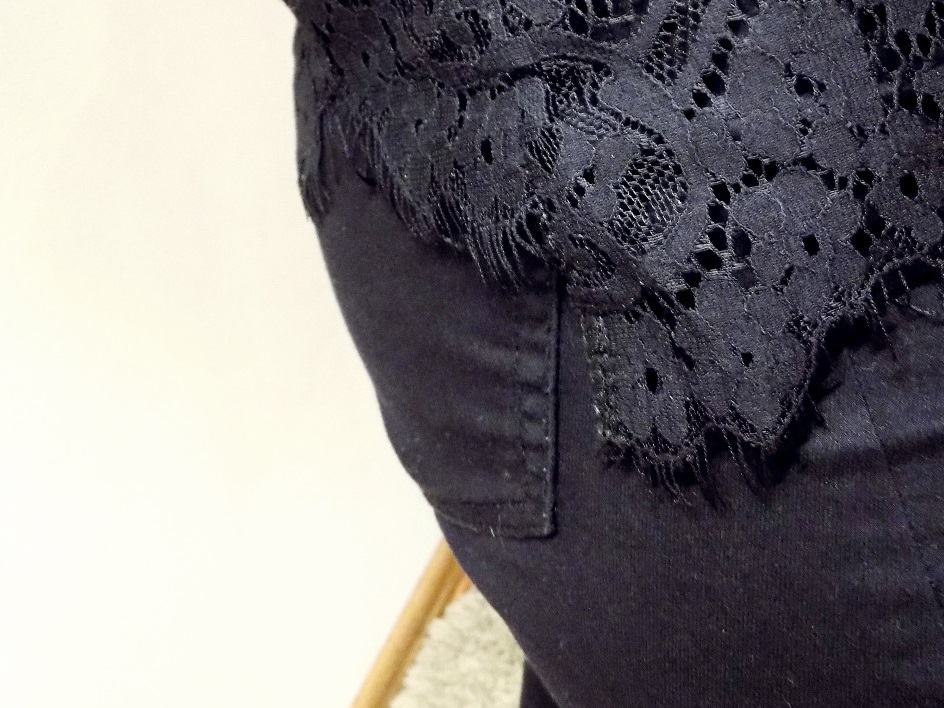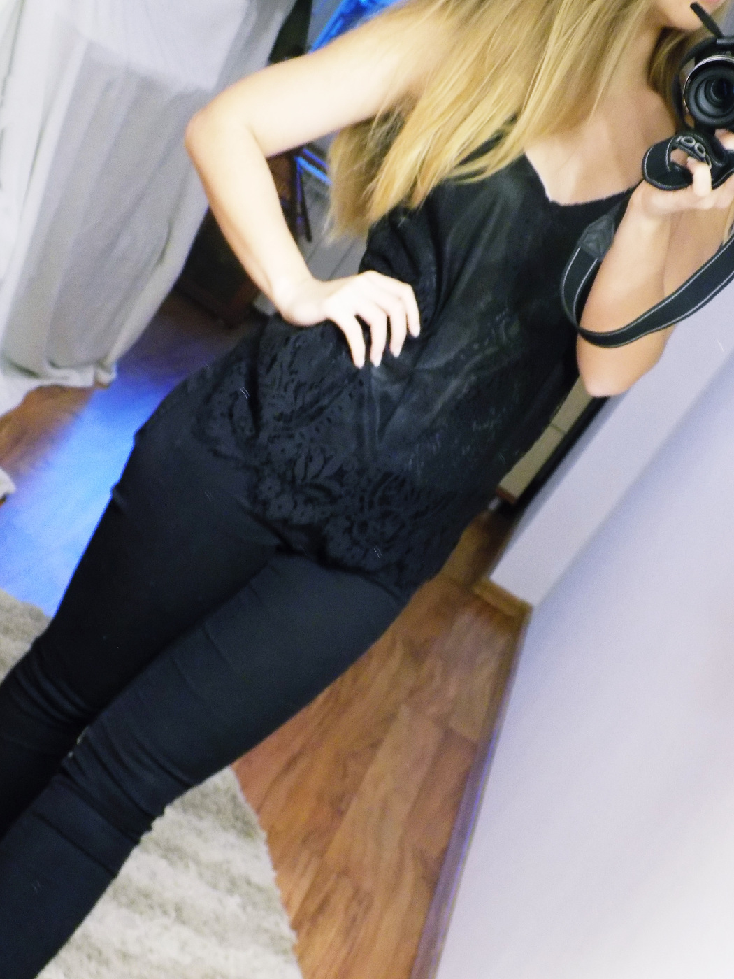 I ostatnią rzeczą, która podoba mi się najmniej z całego zamówienia to czarny top z koronki. Pierwsze co zwróciło moją uwagę to długość. Zobaczcie na zdjęciu jak różni się tył od przodu. Na stronie sklepu ukazany jest ten drobny szczegół, jednak ja nie zwróciłam na to uwagi podczas składania zamówienia. Poza tym top wygląda w porządku. Koronka jest dobra gatunkowo i raczej nie powinna się pruć, „siepać”. Bardzo podoba mi się tył bluzeczki. Cały top ma podszewkę, dzięki czemu nic nie prześwituje. Znajdziecie go TUTAJ → KLIK