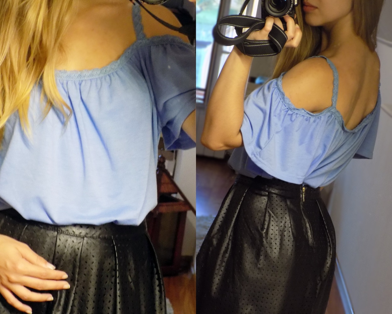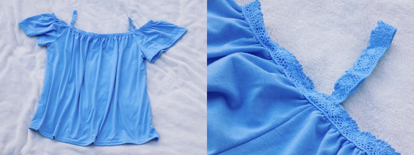 Niebieska bluzka z odkrytymi ramionami (LINK TU) Bluzeczka identyczna jak na stronie. Jest lekko oversizowa, przez co moim zdaniem najlepiej wygląda po włożeniu ją w spódnicę/jeansy. Mój rozmiar to S i przyznam, że mogłaby być mniejsza, ponieważ jestem bardzo drobna. Na szczęście bluzeczka mi nie spada więc poprawki będą zbędne :)