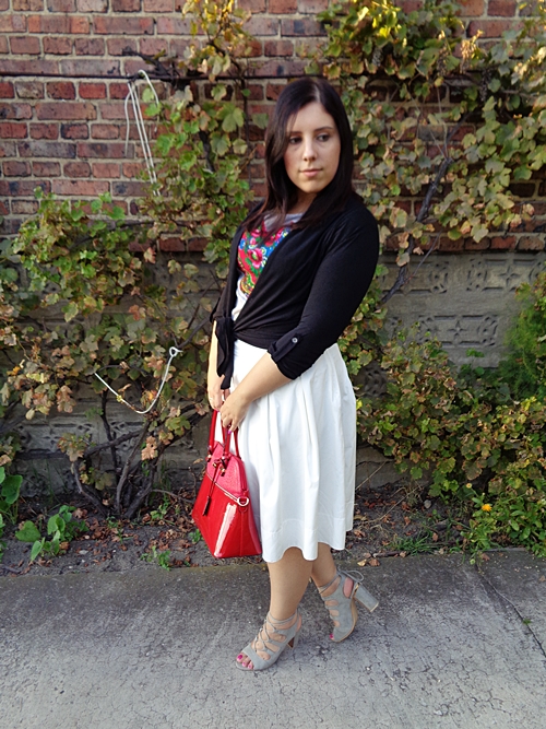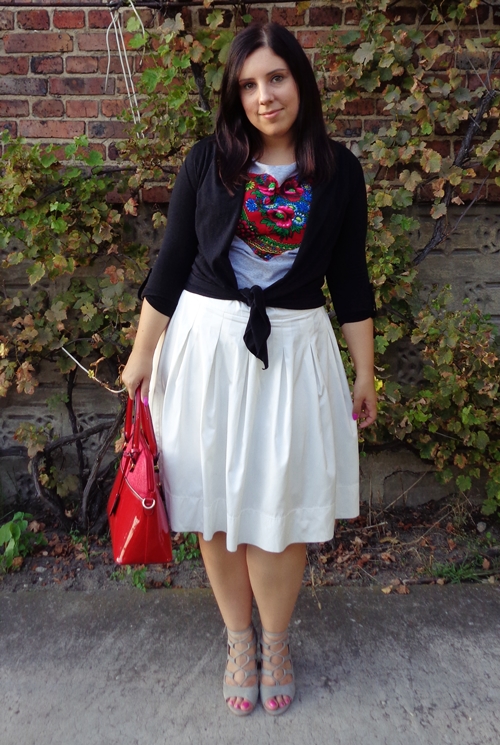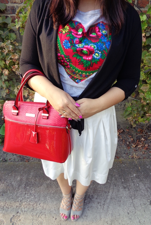 Tym razem połączyłam ją z typową letnią spódnicą i wygodnymi sandałkami. Było jednak za zimno by nie założyć czegoś z rękawem.