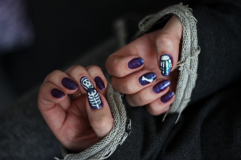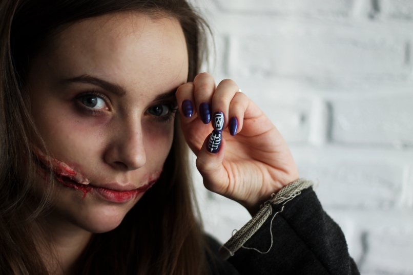 Swoją charakteryzację wykonałam za  pomocą sztucznej skóry domowej roboty - czyli żelatyny z wodą - oraz cieni do powiek i pomadek. Sposób jest banalnie prosty, wystarczy puścić wodzę fantazji i możemy wykreować zerwaną twarz, poderżnięte gardło, wyrwany policzek czy właśnie chelsea smile. Do tego odrobina bordowego cienia pod oczy i creepy wygląd gotowy! Dorobiłam sobie też tematyczne paznokcie, wzorki malowałam ręcznie, oczywiście lakierami hybrydowymi. Na pozostałych paznokciach mam lakier z Dresslilly, ten magnetyczny. Udało mi się osiągnąć ciekawy efekt pasków, dzięki magnesowi na lodówkę :D