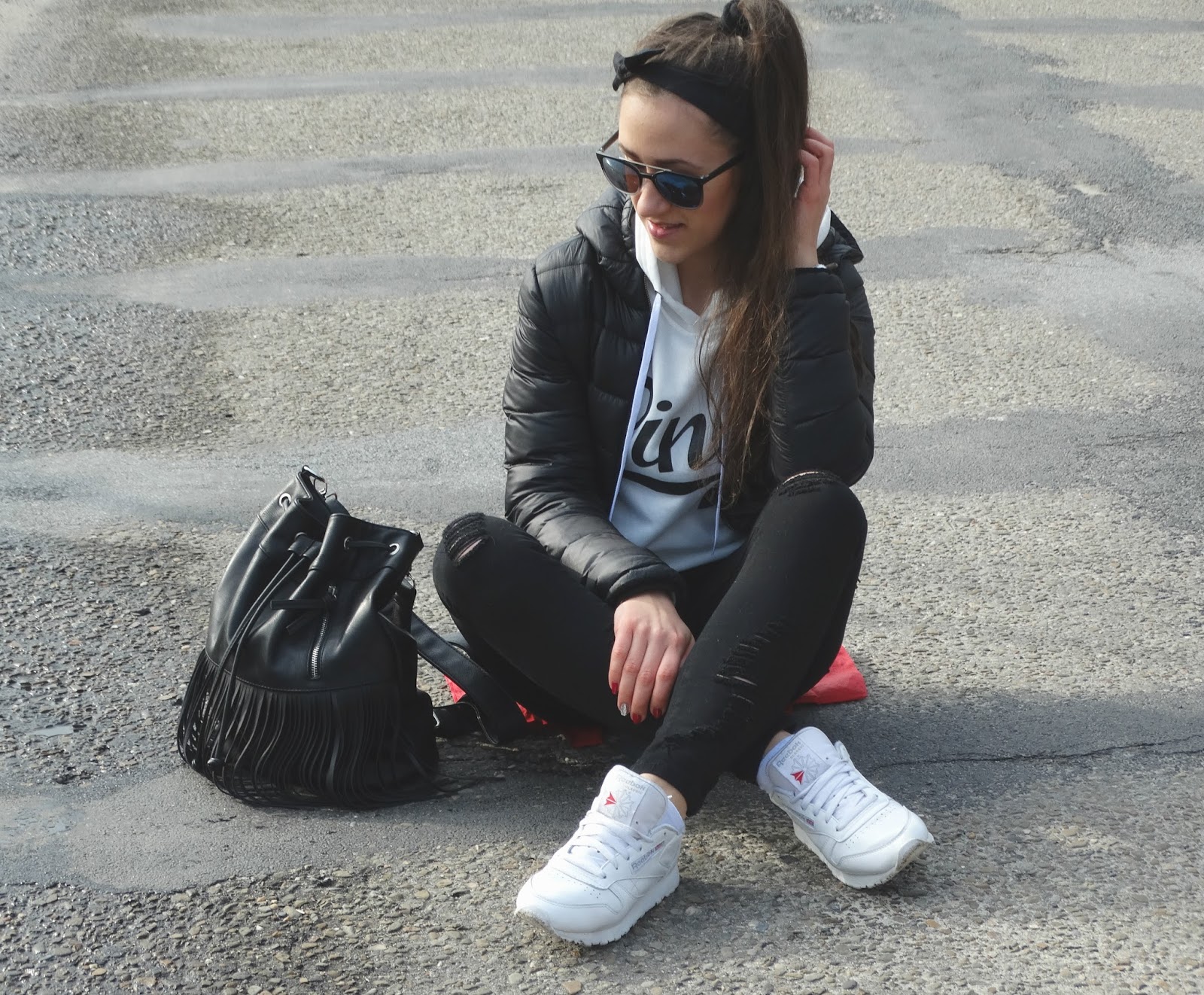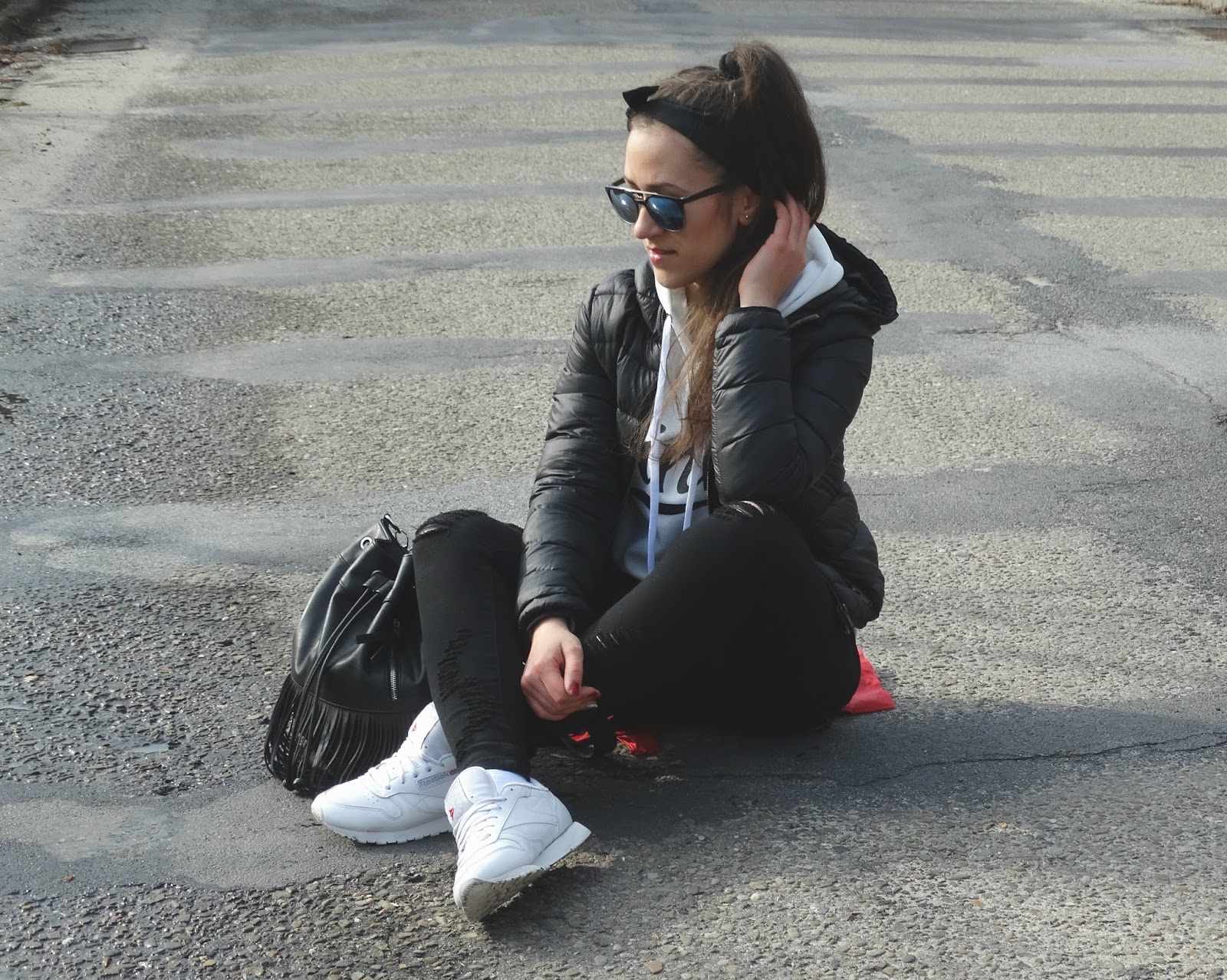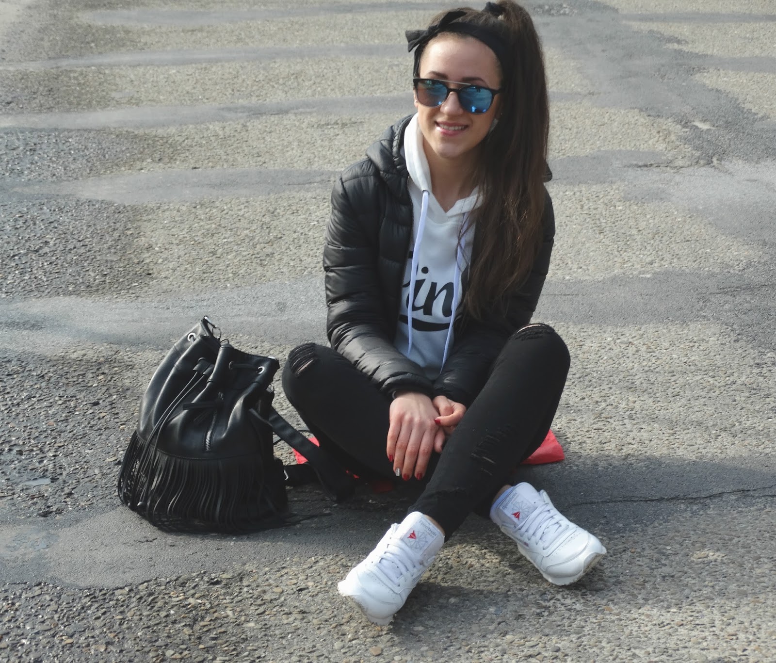 Zobacz oryginał pon., 22/02/2016 - 13:00Hej ! Dzisiaj mam dla Was stylizację z soboty. Typowo na sportowo z moim ukochanym zestawieniem kolorystycznym. Aby nie było zbyt typowo i nudno - spodnie z dziurami, torebka z frędzlami, opaska we włosach i wysoki kucyk dodają stylizacji charakteru. W mojej szafie zawitała kolejna para spodni z dziurami - uwielbiam je, kolejne z she in, które są mega mięciutkie przez co bardzo wygodne. Mam nadzieję, że stylizacja Wam się spodoba. Dzisiaj duża dawka zdjęć, zapraszam !:)