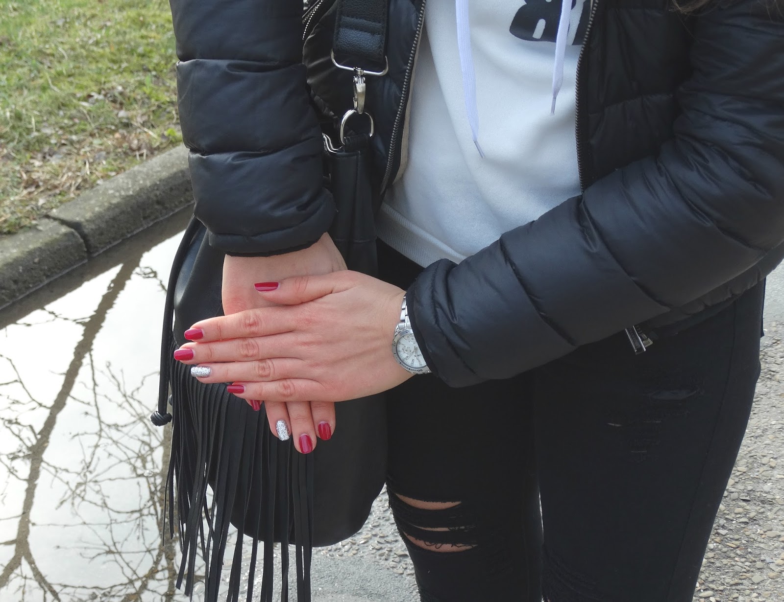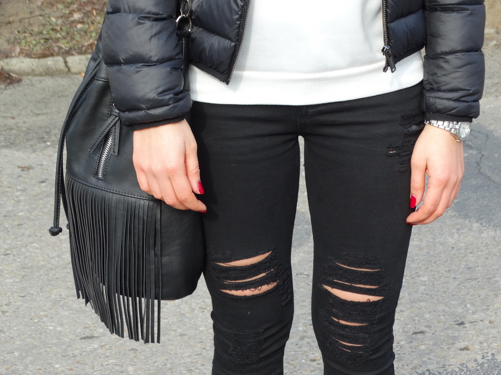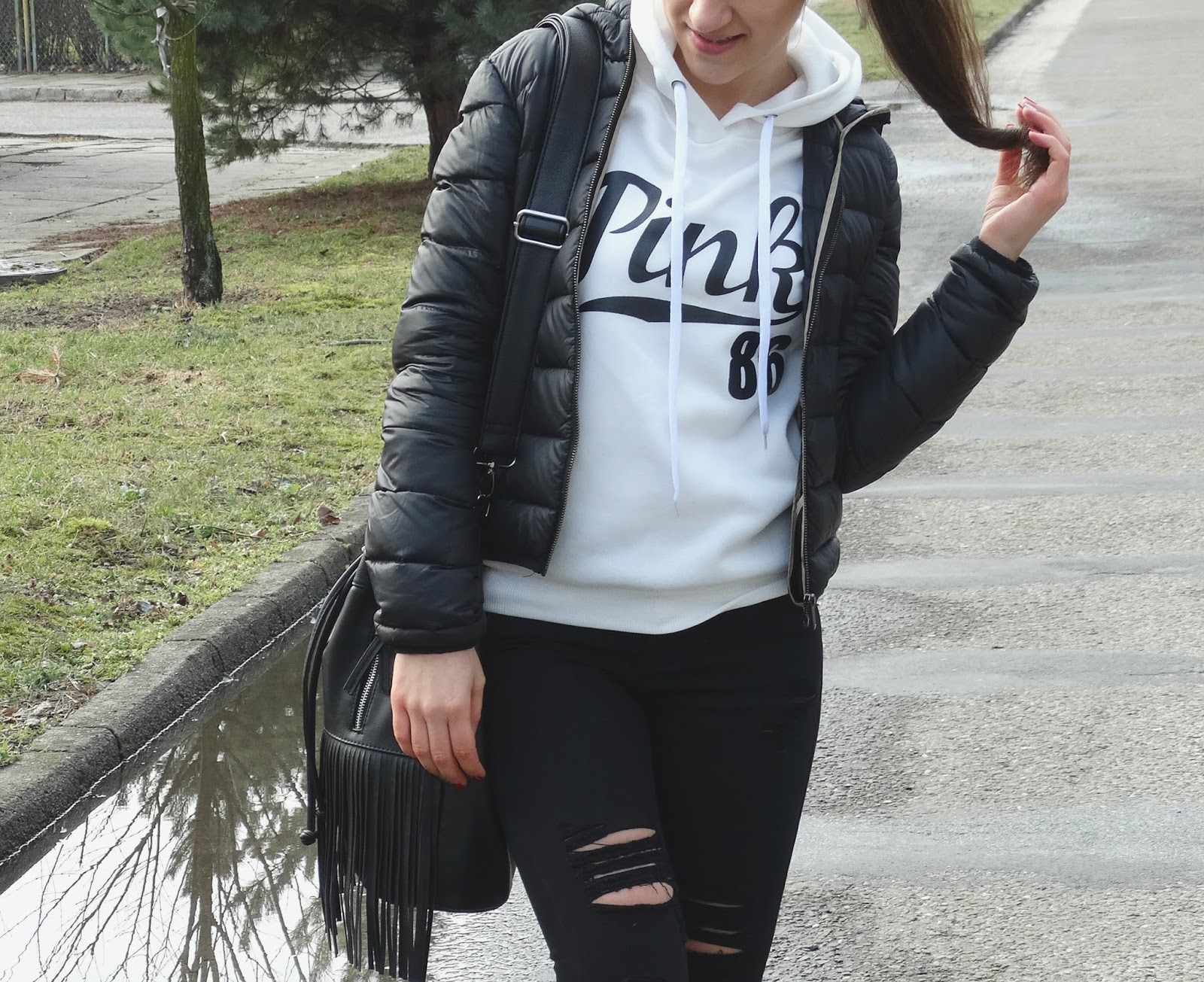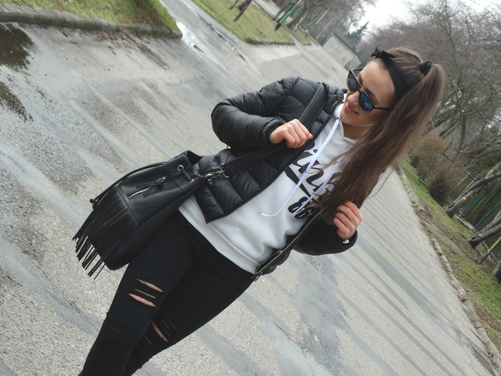 Zobacz oryginał pon., 22/02/2016 - 13:00Hej ! Dzisiaj mam dla Was stylizację z soboty. Typowo na sportowo z moim ukochanym zestawieniem kolorystycznym. Aby nie było zbyt typowo i nudno - spodnie z dziurami, torebka z frędzlami, opaska we włosach i wysoki kucyk dodają stylizacji charakteru. W mojej szafie zawitała kolejna para spodni z dziurami - uwielbiam je, kolejne z she in, które są mega mięciutkie przez co bardzo wygodne. Mam nadzieję, że stylizacja Wam się spodoba. Dzisiaj duża dawka zdjęć, zapraszam !:)