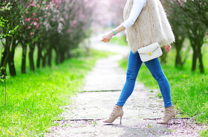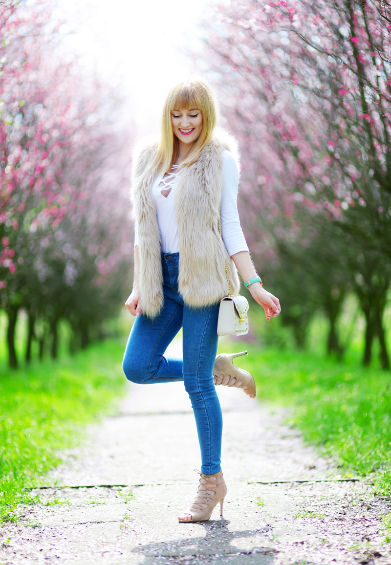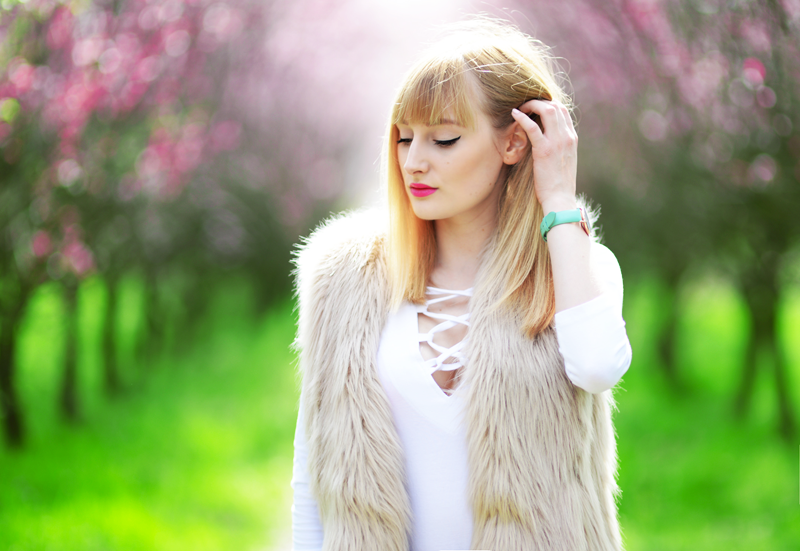 Zobacz oryginał pon., 25/04/2016 - 15:26Każdego roku o tej porze, udaję się do pobliskiego miasteczka, gdzie kwitnie przepiękna alejka. Jej widok zawsze utwierdza mnie w przekonaniu, że wiosna jest już w pełni z nami i co więcej, świat po prostu staje się piękniejszy. Uwielbiam to miejsce, które pachnie wolnością, lekkością i słońcem. To tak naprawdę tylko rzędy kwitnących drzew, ale dzięki tak oczywistym rzeczom, które nas otaczają właśnie świat dookoła staje się niesamowity. Nie mogło mnie zabraknąć w tym miejscu i tego roku, ale niestety trochę się spóźniłam. Drzewa powoli przekwitały, a ich kopuły nie były już gęstymi falami kwiatów. Niewiele to jednak zmieniło. Efekt i tak okazał się piękny, miejsce nie straciło uroku, a ja mogłam znów nacieszyć się tym wiosennym widokiem, wziąć głęboki wdech i poczuć tą błogą ciszę, radość i spokój. To miejsce naprawdę jest magiczne, choć tak pospolite. Wycisza, regeneruje myśli, jest niczym ładowarka. Mam kilka takich miejsc, które tak pozytywnie mnie nastrajają. Cieszę się, że są w zasięgu moich rąk, że mogę wsiąść w samochód, pojechać tam, nacieszyć się i wrócić tam kiedy tylko mam na to ochotę. Przy okazji odwiedzin ulubionej alejki, sfotografowałam też moją stylówkę, która wpada w nieco elegancki styl, głównie za sprawą pięknych, wiązanych sandałów. Body ze sznureczkami na dekolcie to mój hit, a futerkowa kamizelka jest jednym z najlepszych zakupów, jakie zrobiłam. Ahh, już nie mogę doczekać się kwietnia roku następnego, by zrobić na tej alejce kolejne cudowne, pachnące radością zdjęcia!