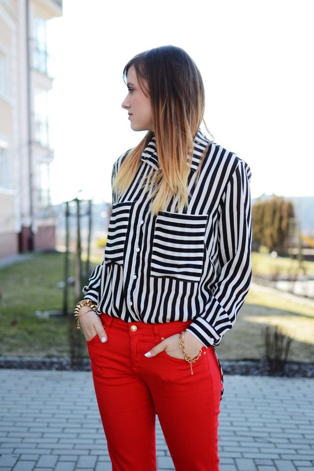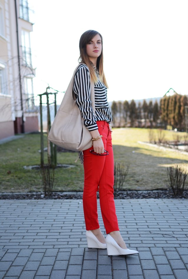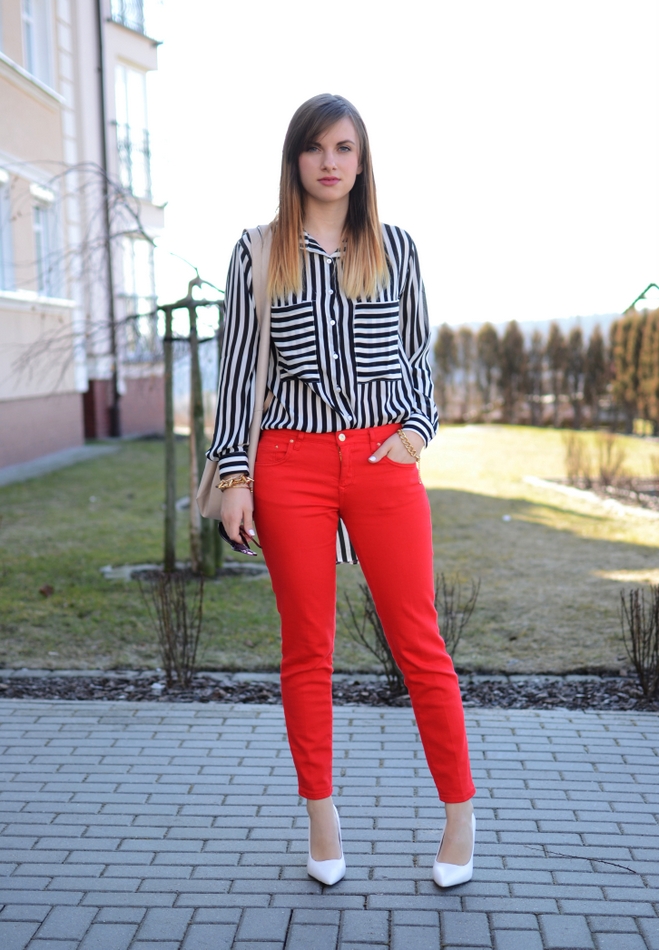 Paski to zdecydowanie jeden z najgorętszych hitów tego sezonu. I nie dziwi mnie fakt, że pojawiają się niemal na każdym blogu. Ja sama od dawna jestem ich wielką fanką. W tym sezonie modne są i wąskie i szerokie ale koniecznie pionowe. Wyglądają świetnie w zestawieniu z bielą, czernią czy jeansem. U mnie pojawiły się w towarzystwie mocnej jaskrawej czerwieni. Oba elementy garderoby, zarówno koszula jak i spodnie są dość krzykliwe więc żeby nie odwracać od nich uwagi, wybrałam neutralne dodatki w postaci bieli i beżu. W takim połączeniu czuję się bardzo dobrze!