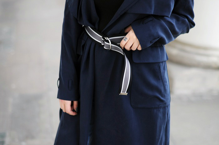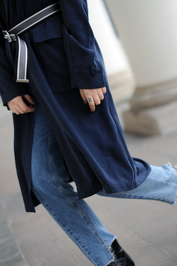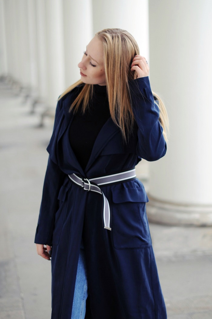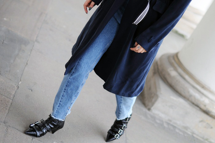 Do paska dobrałam długi wiosenny granatowy płaszcz, poszarpane na dole dwukolorowe jeansy i skórzane botki z klamrami, na kaczuszce, które ostatnio dostałam w prezencie i skradły moje serce.