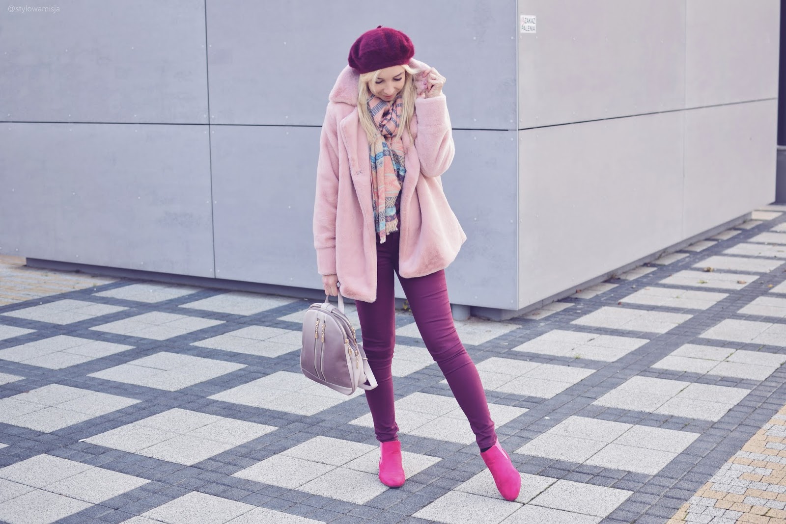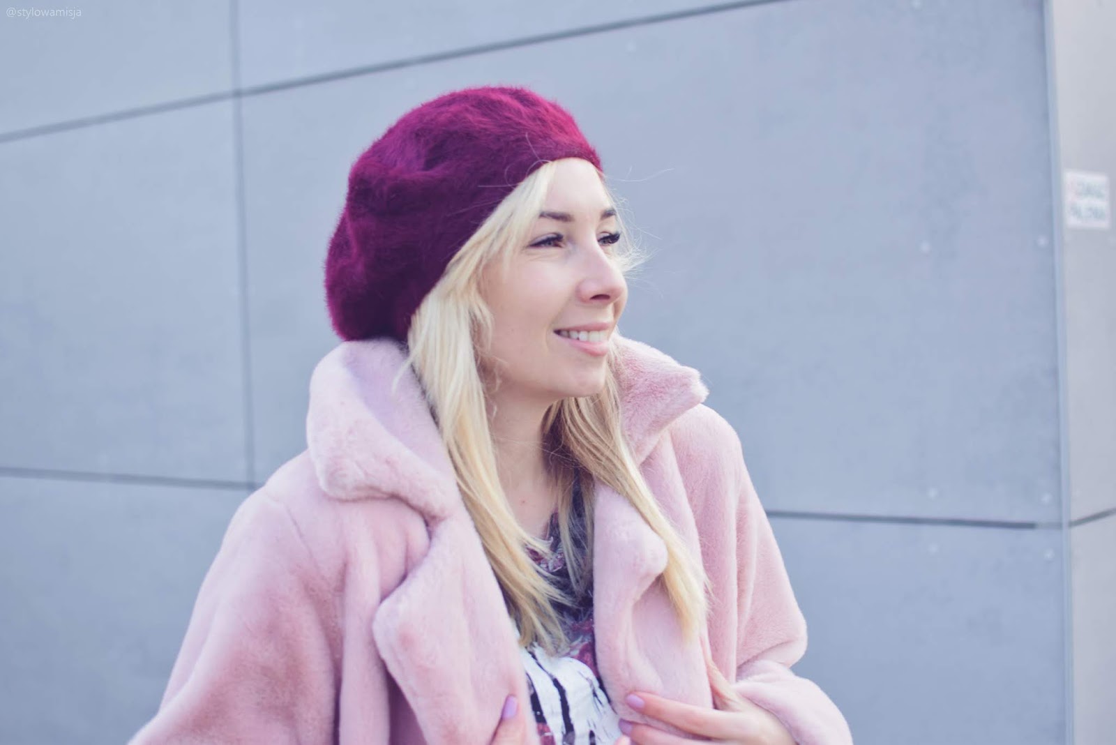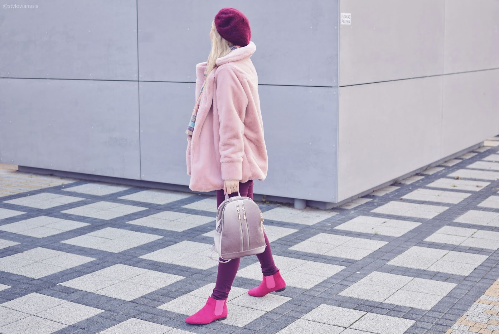 To look idealny dla osób, które dużo poruszają się po dworze ponieważ np. dojeżdżają do pracy, szkoły autobusem. Tak naprawdę to bardzo proste i niewymagające zestawienie. Wystarczy dobrać kolory pod siebie. Ja postawiłam na odcienie różu i czerwieni, ponieważ czuję się w nich bardzo dobrze. Spodnie dają komfort noszenia, a płaskie botki zagwarantują wygodę. O tej porze roku polecam jednak postawić na ocieplane buty. Moje nie są i nogi nieco zmarzły mi podczas tej sesji. Beret to kolejny trend tego sezonu, więc warto zaopatrzyć się w moherowe nakrycie głowy. Wisienką na torcie tej dziennej stylizacji z plecakiem jest duże różowe futro, które nie dość że wygląda bardzo designersko, to jeszcze daje całkiem dużo ciepła. Założenie pod nie swetra zapewnia dużą dawkę ciepła. Średniej wielkości plecak ombre z zewnętrznymi kieszonkami idealnymi np. na bilet to dobre rozwiązanie na spacer, czy podróż. Jak widać więc, kombinacja jest prosta, ale dzięki kolorystyce i różnym fakturom materiałów, całość prezentuje się bardzo stylowo.