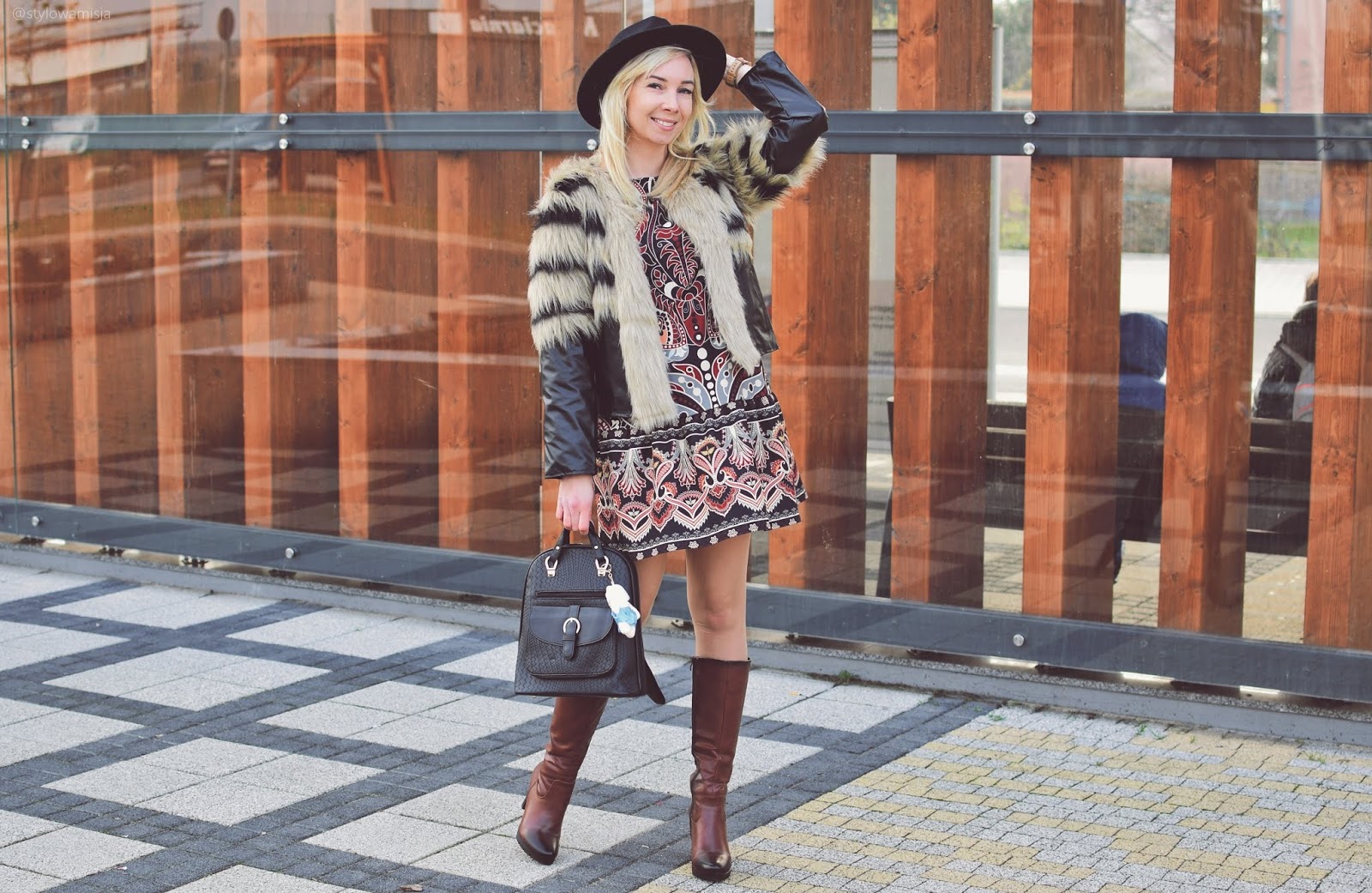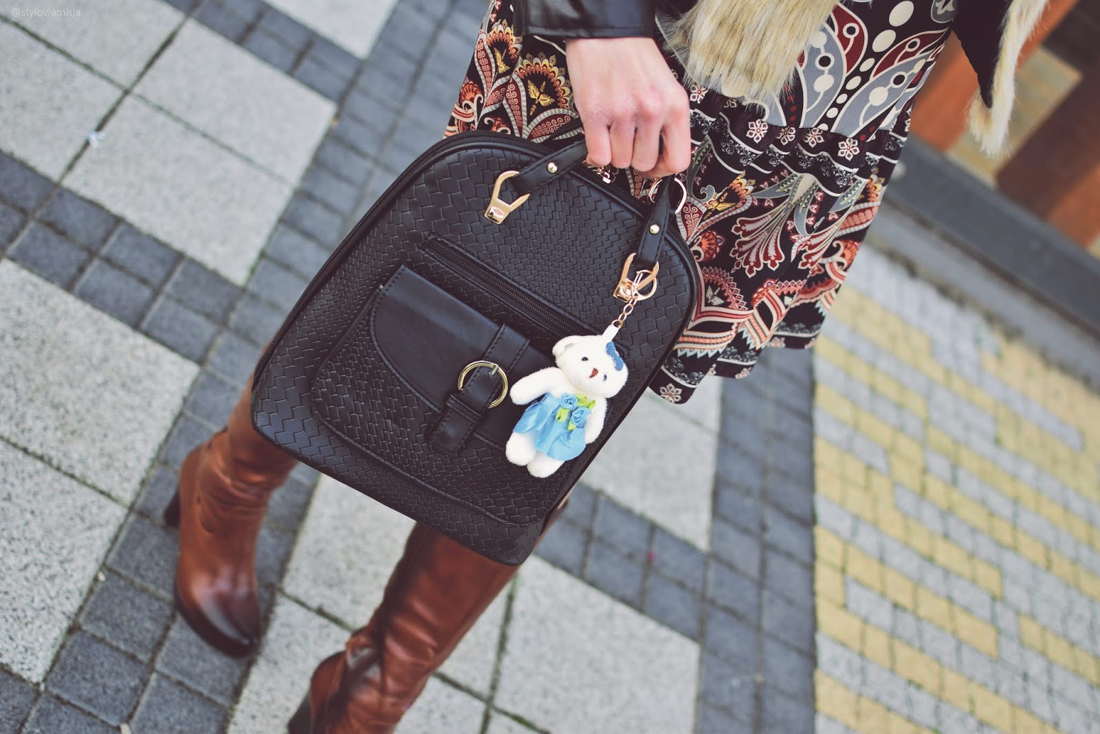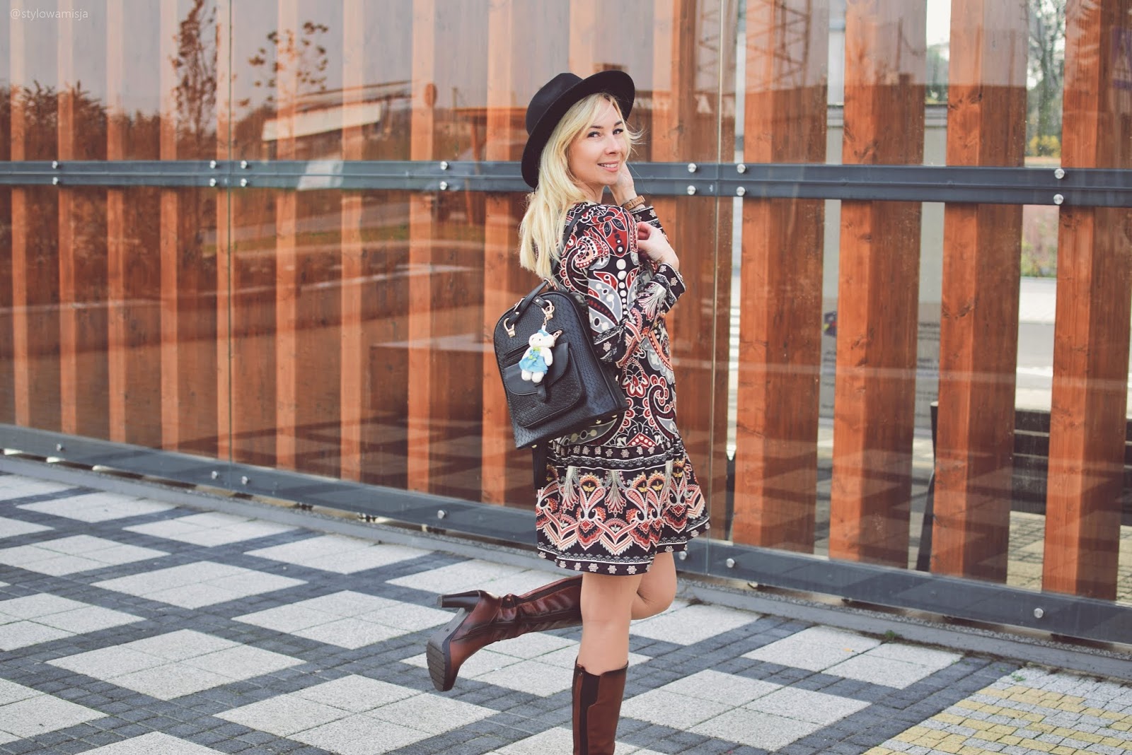 elementy stylizacji: czarny plecak (podobny) PARISO | brązowe kozaki TRENDYBUTY | sukienka we wzory SUKIENKOWO