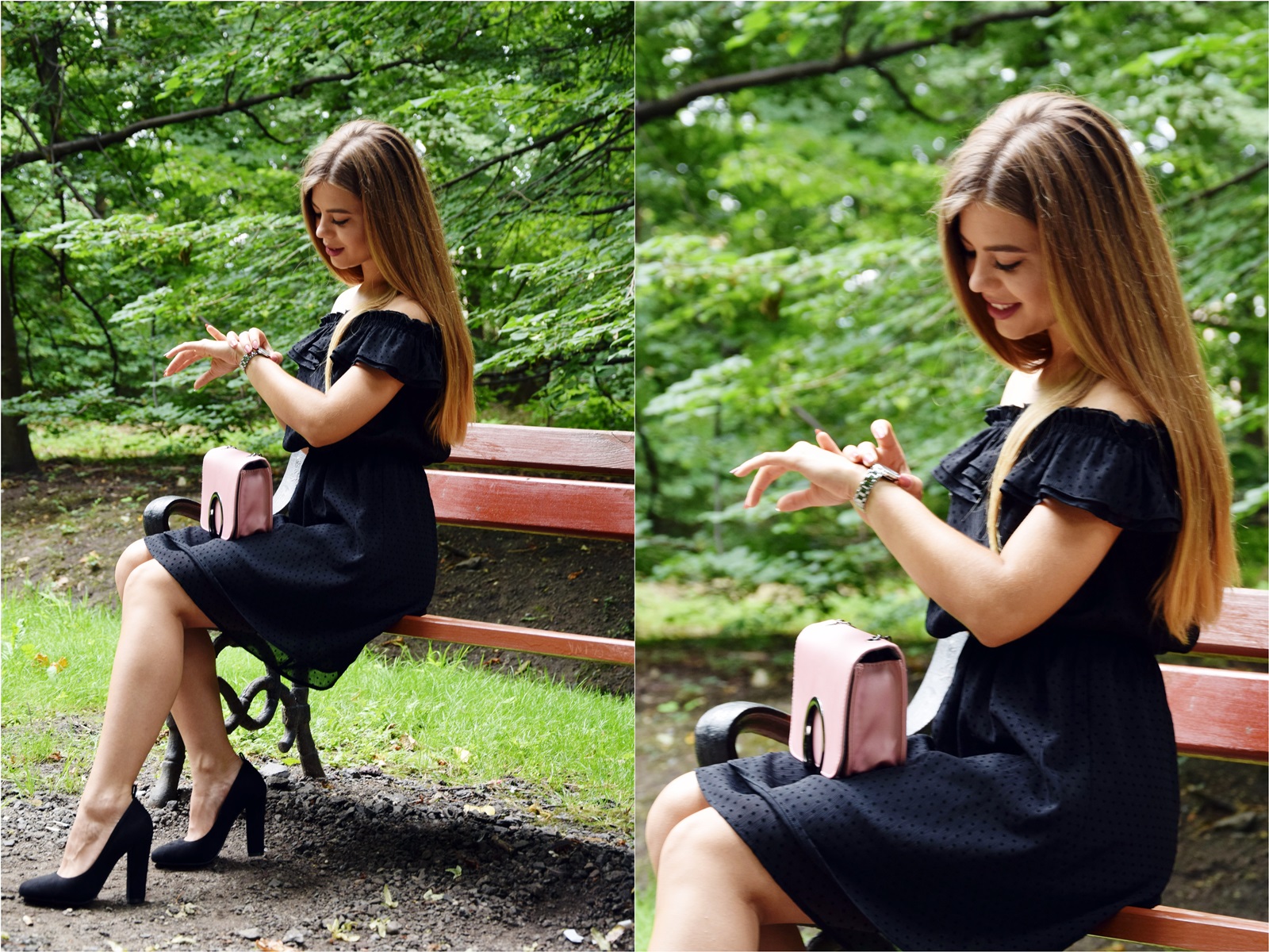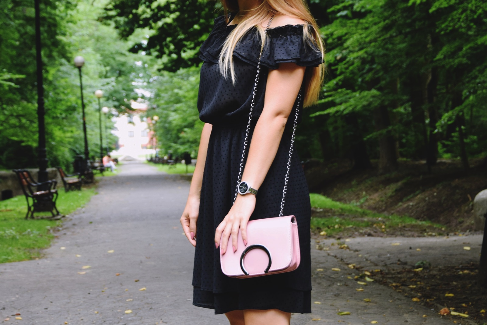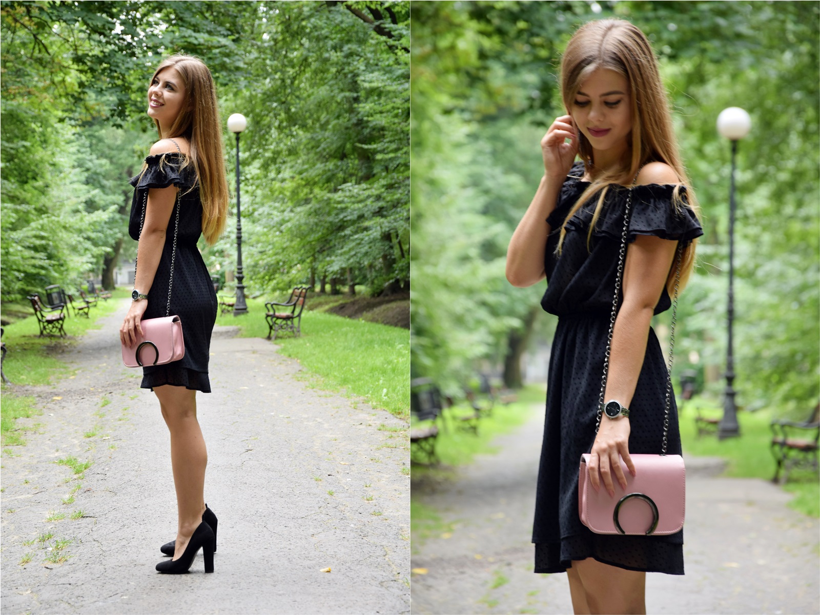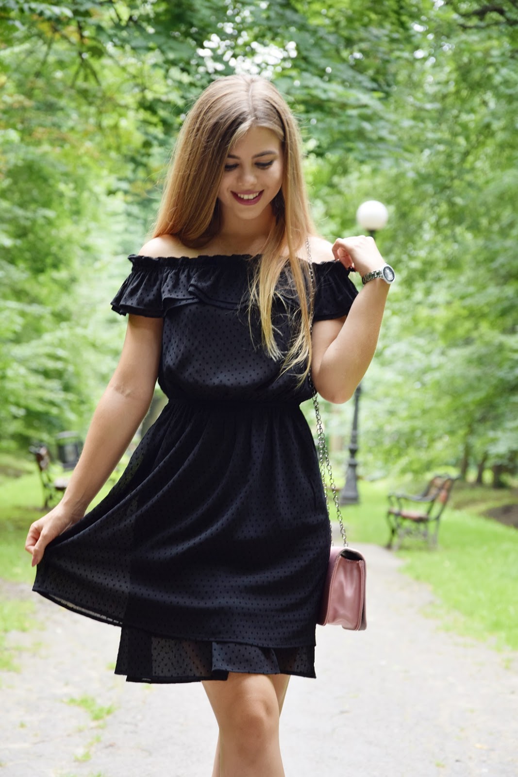 Sukienka ma wszystko co lubię – falbanką, kropki i gumkę w pasie, która nie zaburza proporcji sylwetki. Jest urocza i bardzo ją lubię. Do niej dobrałam czarne czółenka i oczywiście moją nową perełkę, czyli różową torebkę ze sklepu Rosegal. Pewnie niektóre z Was pamiętają jak radziłam się Was na moim FB jaki kolor torebki mam wybrać. Miałam do wyboru róż i czerwień – wygrał róż :D Jednak na stronie sklepu nie wyglądała na taką, która połyskuje, więc torebka moim zdaniem pasuje tylko do eleganckich stylizacji. Bardzo podoba mi się jej kształt oraz modne koło na klapie i wbrew pozorom jest bardzo pojemna :) Niestety szybko się brudzi i ciężko zetrzeć z niej plamy. Moja dzisiejsza stylizacja prezentuje się elegancko i dziewczęco, czyli tak jak lubię :) Jak Wam się podoba? Czekam na Wasze komentarze :)