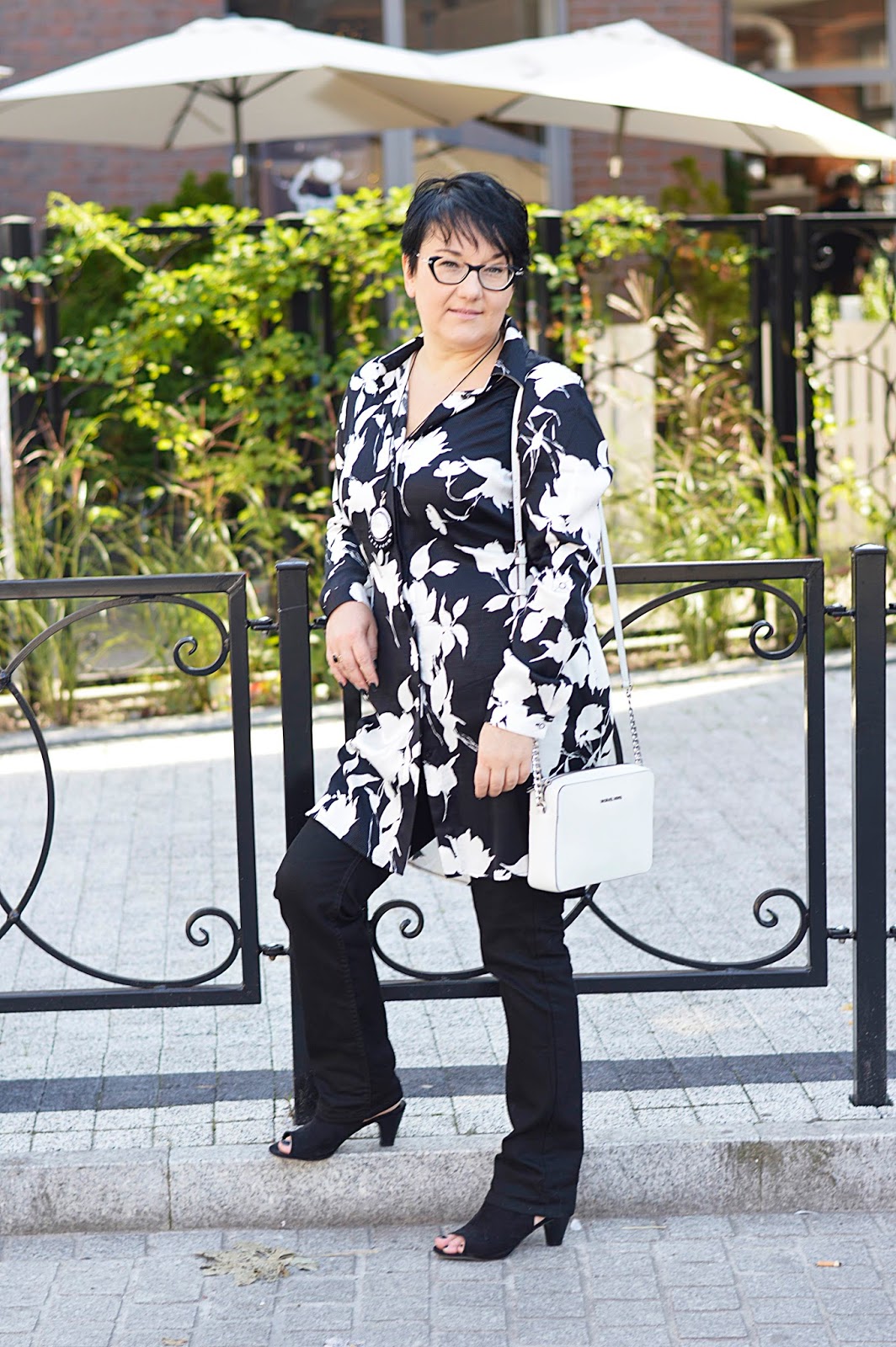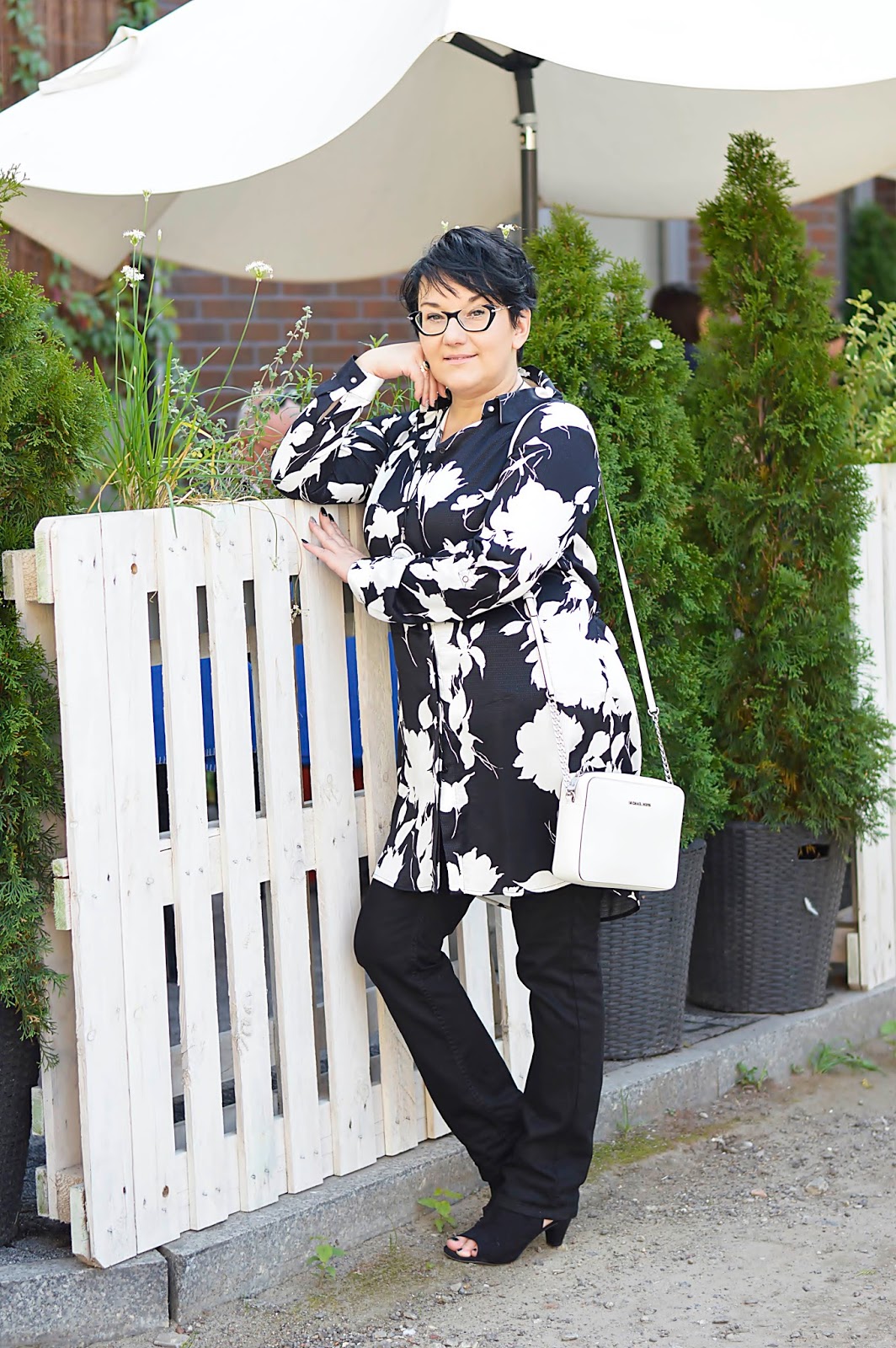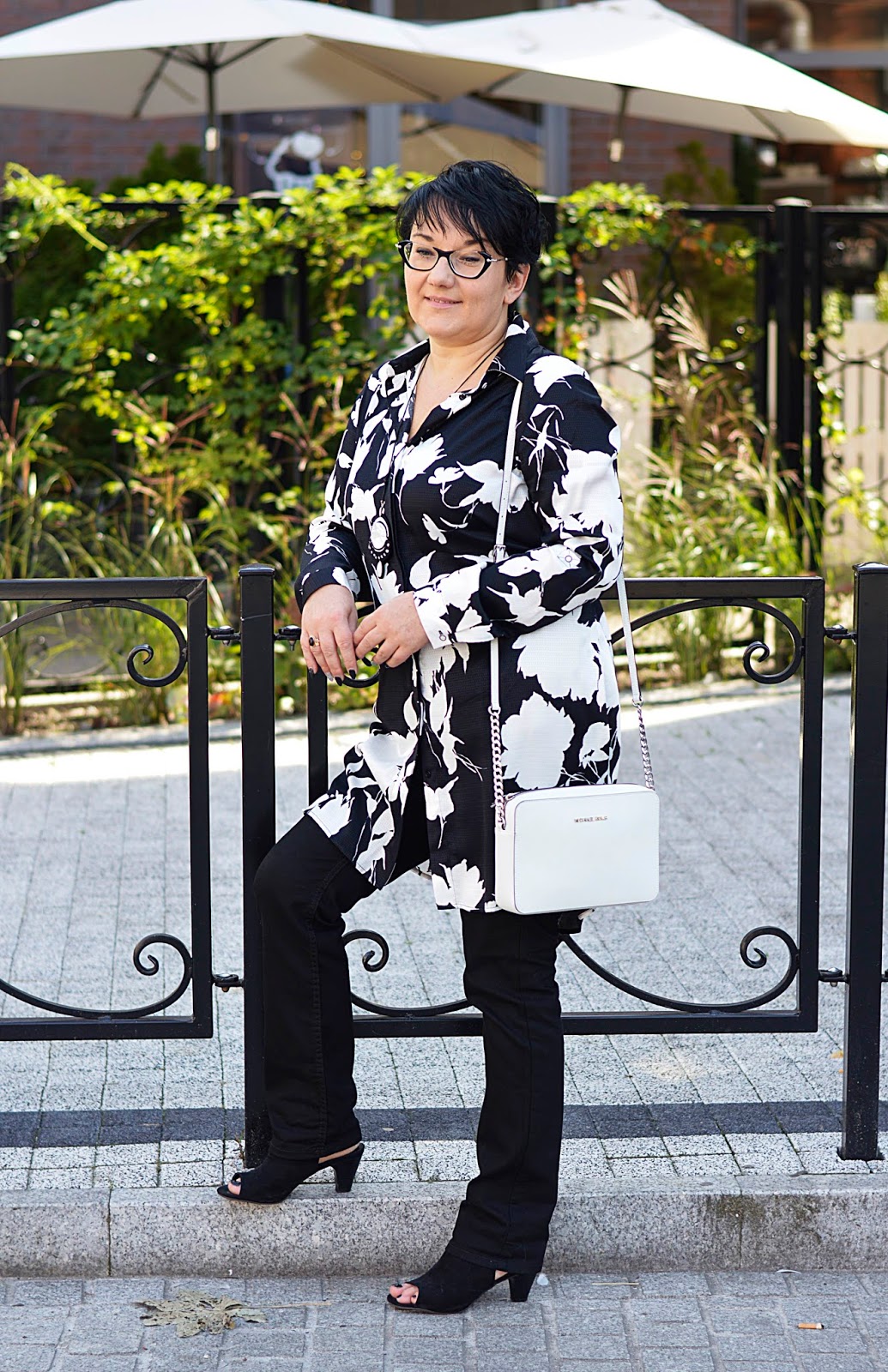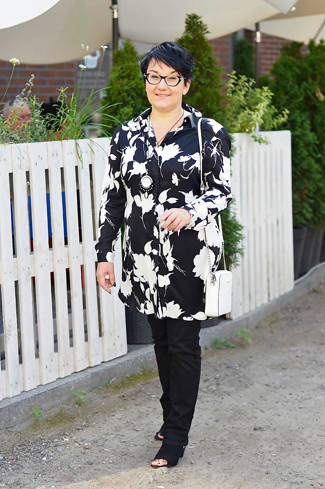 Tę kwiecistą sukienkę zobaczyłam w Reserved jeszcze latem. Te kwiaty i fason, mmmm. W dodatku w "moich" kolorach. Dostępna była w kolekcji "must have", co niestety owocowało dosyć wysoką ceną. Uszyta jest z wiskozy, więc myślałam, że to za tkaninę "się płaci". W dotyku jest bardzo miła. Ostatecznie, kilka tygodni później trafiłam na promocję chyba dwudziestoprocentową, więc jak widzicie, jest moja. Wracając do tkaniny; miałam ja na sobie tylko raz i po powrocie do domu, w miejscu, gdzie dotyka jej torebka, powstały zmechacenia. Jestem bardzo zawiedziona. Po jednym noszeniu ? to co będzie po kolejnych ? Po praniu ? Z tym dylematem trwam od kilku tygodni, bo szkoda oddać mi jej do reklamacji...Oczywiście można założyć ją solo. Wielbicielki serialu "Przyjaciółki" zapewne pamiętają Zuzę w tej sukience. Ja jednak od razu widziałam ja ze spodniami. Ma ona pasek; nie zawiązałam go tradycyjnie, tylko z tyłu, co prezentowało się dużo lepiej.Dla rozjaśnienia klasyczna biała torebka.