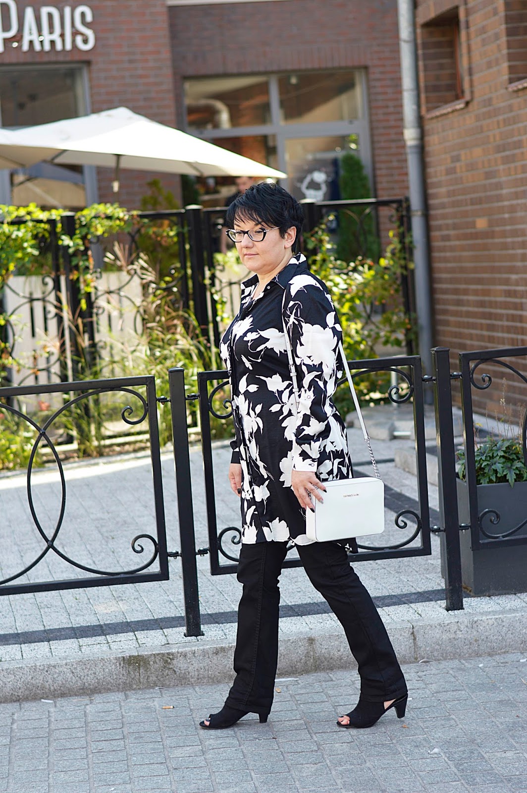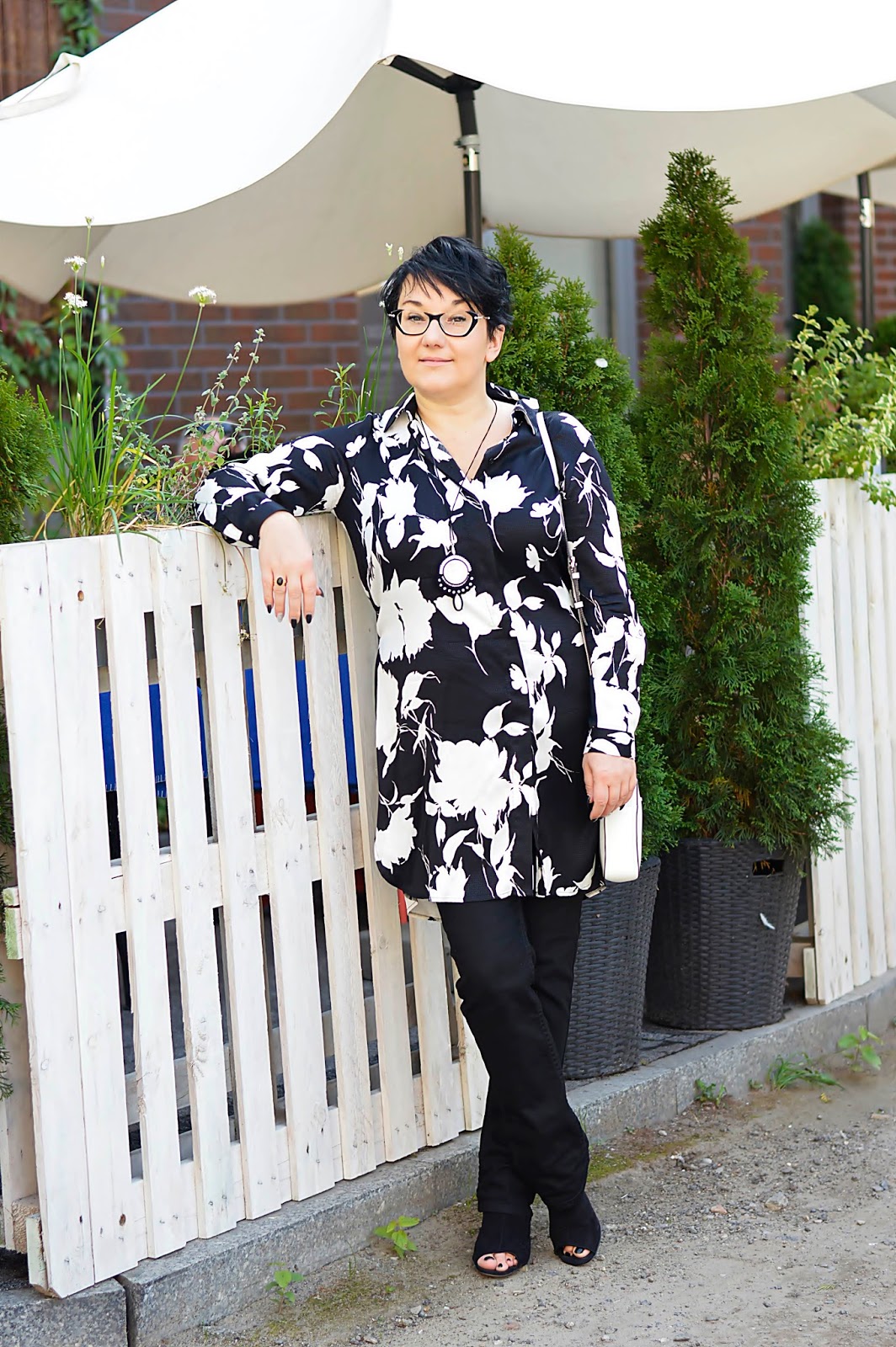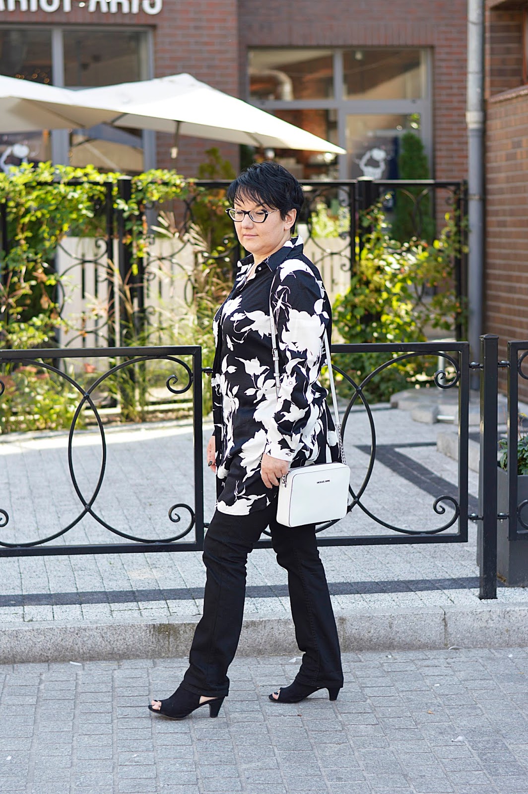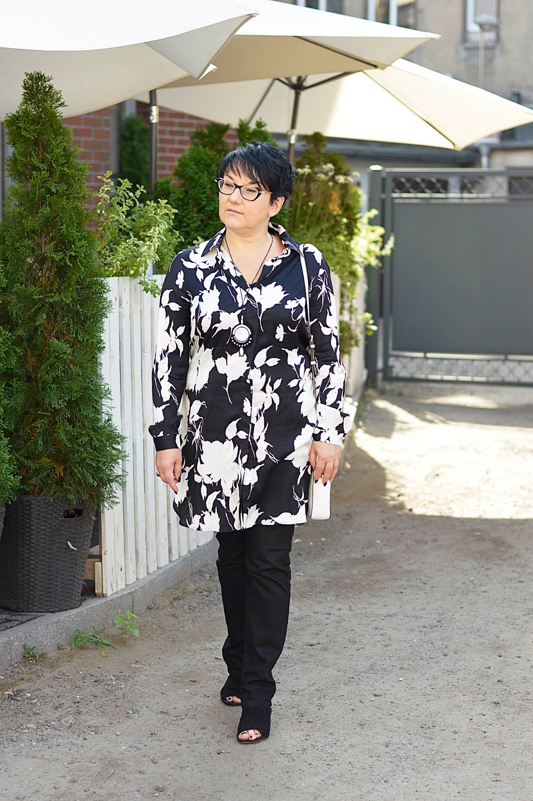Tę kwiecistą sukienkę zobaczyłam w Reserved jeszcze latem. Te kwiaty i fason, mmmm. W dodatku w "moich" kolorach. Dostępna była w kolekcji "must have", co niestety owocowało dosyć wysoką ceną. Uszyta jest z wiskozy, więc myślałam, że to za tkaninę "się płaci". W dotyku jest bardzo miła. Ostatecznie, kilka tygodni później trafiłam na promocję chyba dwudziestoprocentową, więc jak widzicie, jest moja. Wracając do tkaniny; miałam ja na sobie tylko raz i po powrocie do domu, w miejscu, gdzie dotyka jej torebka, powstały zmechacenia. Jestem bardzo zawiedziona. Po jednym noszeniu ? to co będzie po kolejnych ? Po praniu ? Z tym dylematem trwam od kilku tygodni, bo szkoda oddać mi jej do reklamacji...Oczywiście można założyć ją solo. Wielbicielki serialu "Przyjaciółki" zapewne pamiętają Zuzę w tej sukience. Ja jednak od razu widziałam ja ze spodniami. Ma ona pasek; nie zawiązałam go tradycyjnie, tylko z tyłu, co prezentowało się dużo lepiej.Dla rozjaśnienia klasyczna biała torebka.